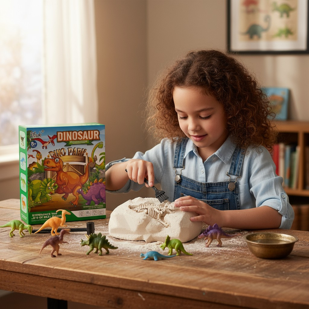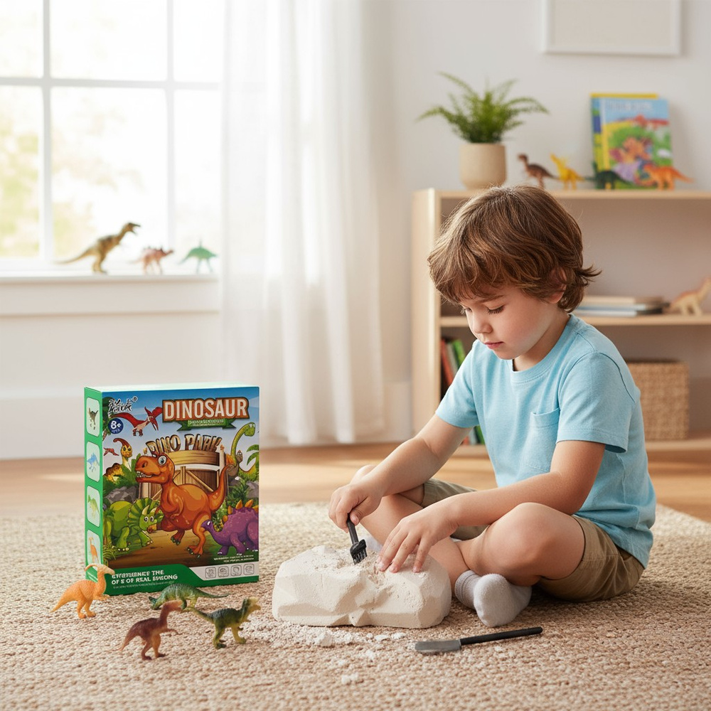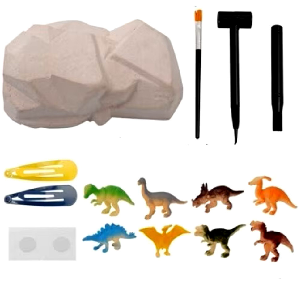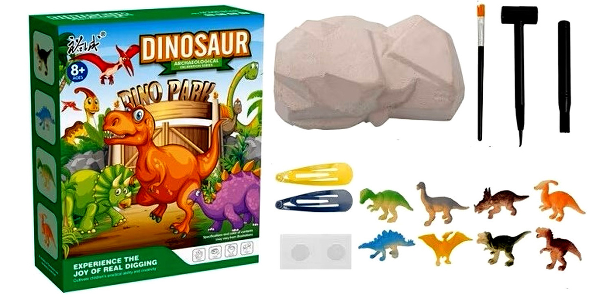 W skład zestawu wchodzą elementy, które symulują prawdziwe wykopaliska: blok skamieliny z ukrytym wewnątrz prehistorycznymi dinozaurami, zestaw narzędzi do wykopywania, spinki/dodatki oraz estetyczne opakowanie prezentowe. Dzięki temu zestawowi dziecko nie tylko bawi się, ale też uczy – poznaje paleontologię, biologiczne i geologiczne podstawy, stymuluje zdolności manualne i rozwija kreatywność.
