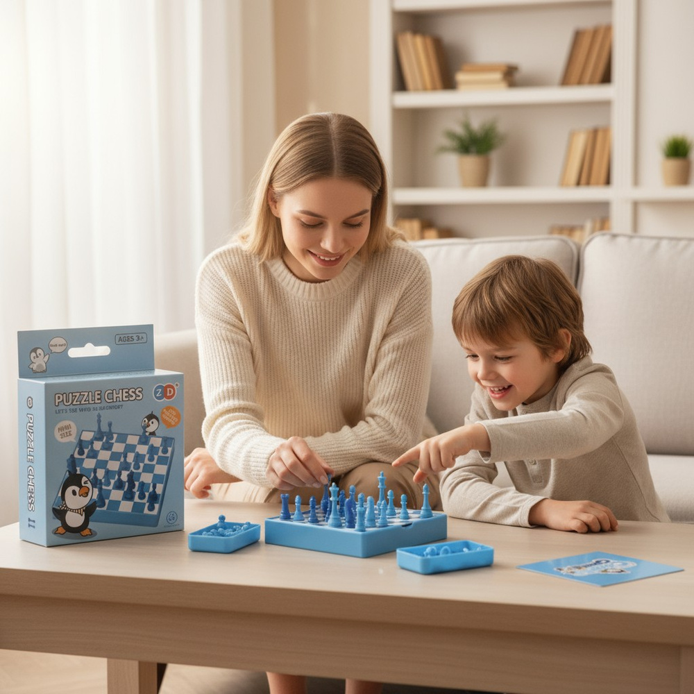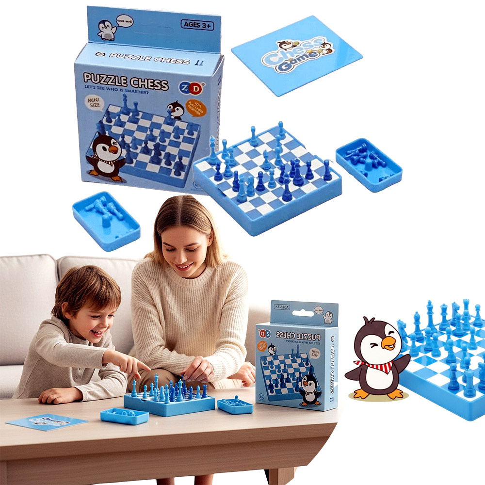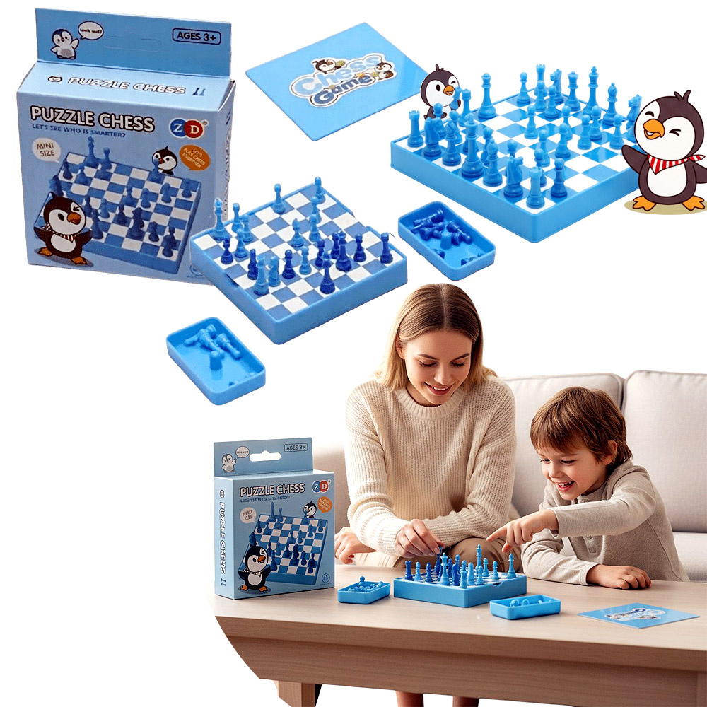 - Kolorowe szachy dziecięce Pingwiny – wprowadzenie do gry logicznej, rozwój myślenia i strategii. Kompaktowy zestaw białe i czarne pionki, plansza, idealne na prezent edukacyjny.