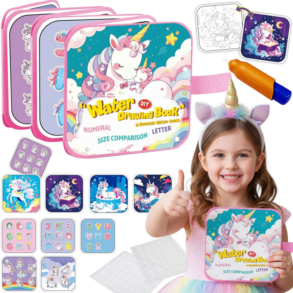 - Poznaj wielorazową wodną książeczkę „UNICORN Jednorożec” – kolorowanie bez brudzenia, zabawa i nauka liter i cyfr, naklejki motywujące, idealna edukacyjna zabawka dla dziewczynki. Doskonała na prezent!