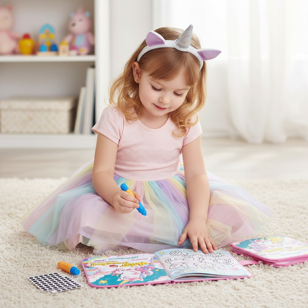 To wielorazowa kolorowanka wodna stworzona z myślą o dziewczynkach, które uwielbiają jednorożce, kolory i naukę poprzez zabawę.