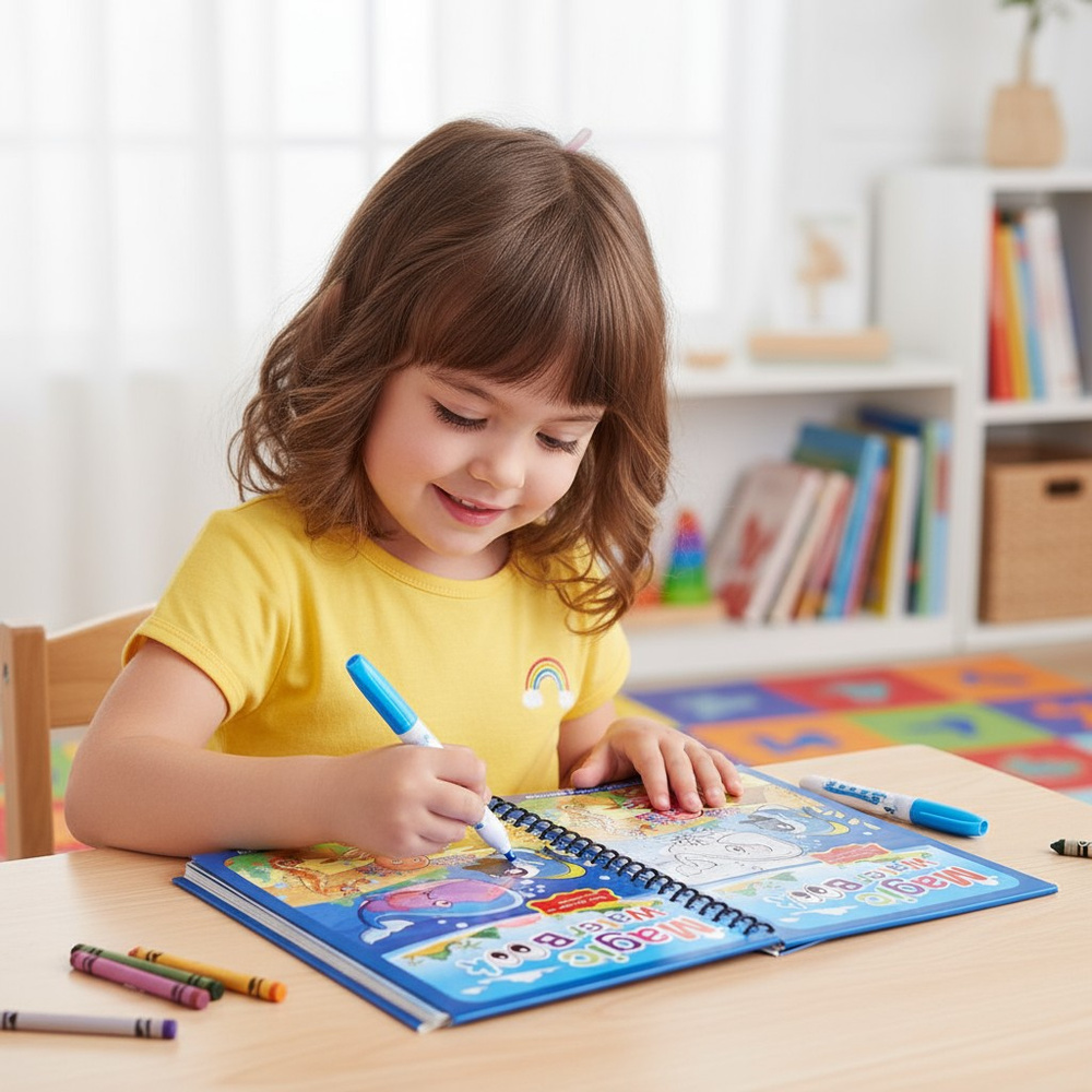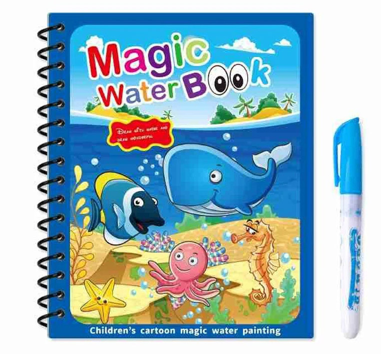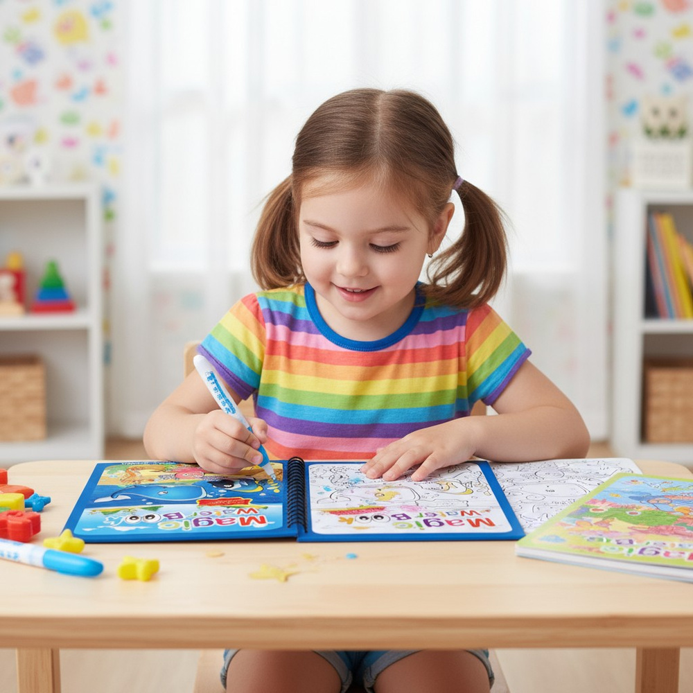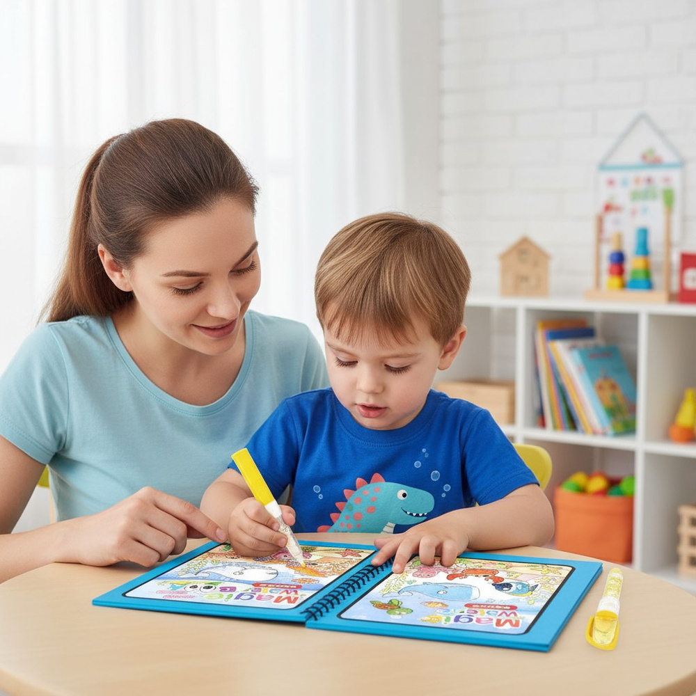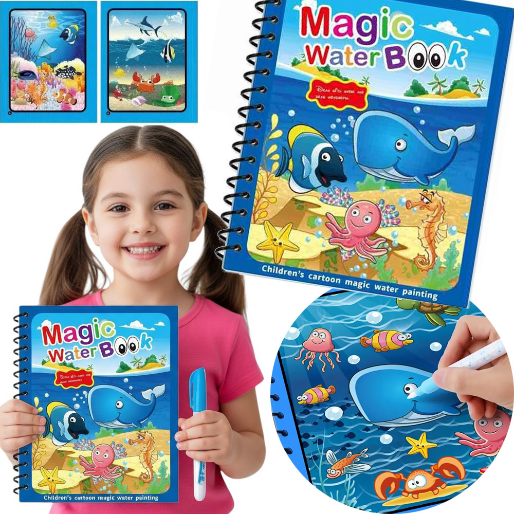 - Kolorowanka / malowanka z pisakiem wodnym na wodę – wielokrotnego użytku książeczka wodna, czysta i kreatywna zabawa, bez bałaganu. Idealna dla dzieci od 3 lat.
