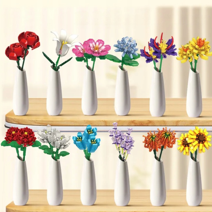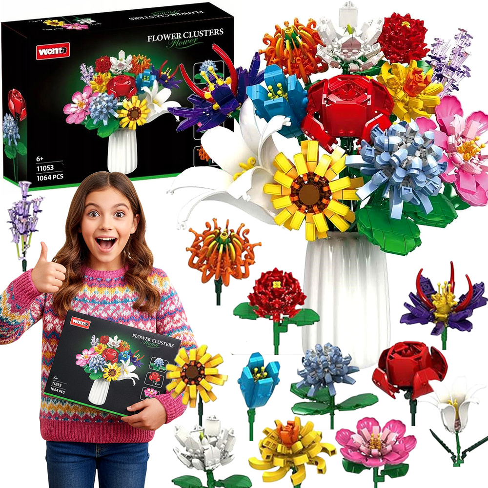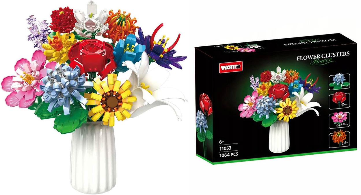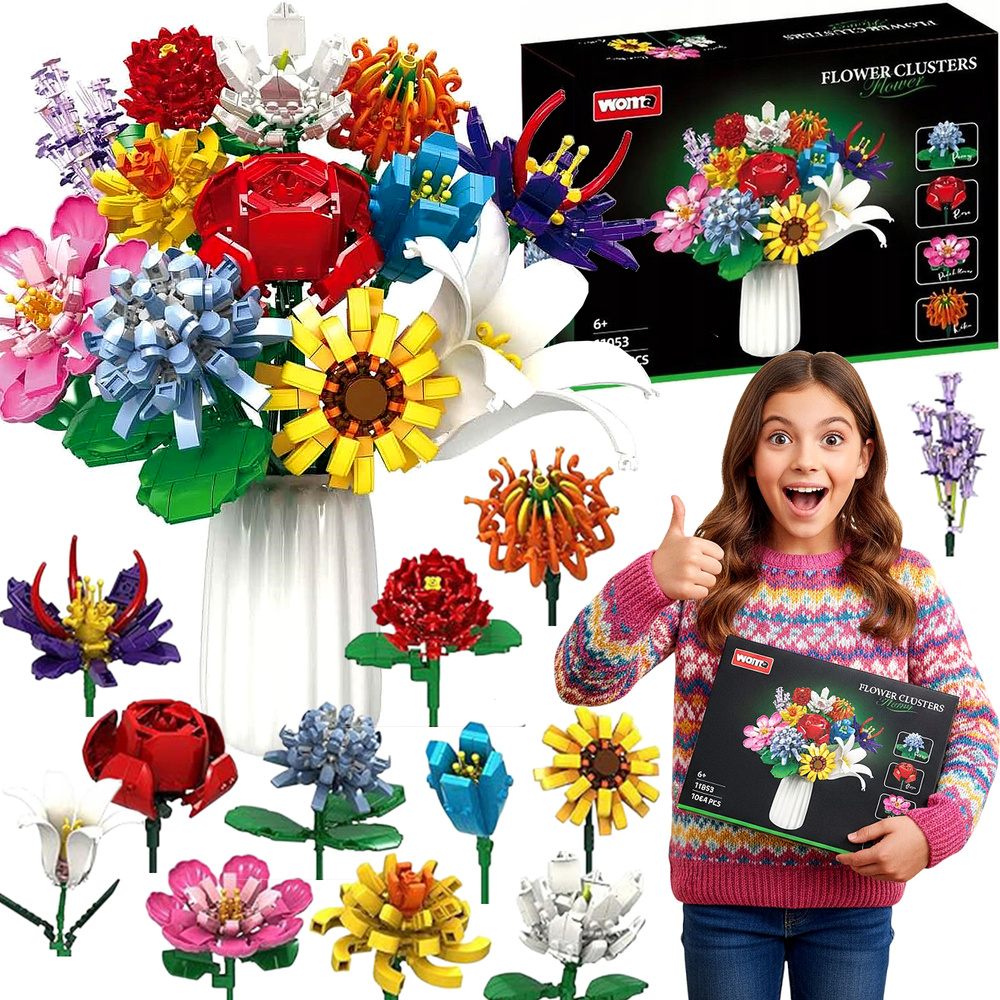 - Zestaw 1064 elementów – klocki konstrukcyjne „Duży Bukiet 12 różnych kwiatów” (Róża, Lilia, Orchidea i inne) dla dzieci od 6 lat. Kreatywna zabawa, dekoracja DIY, rozwój manualny i wyobraźni.