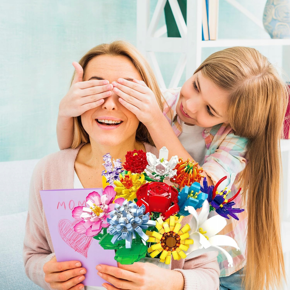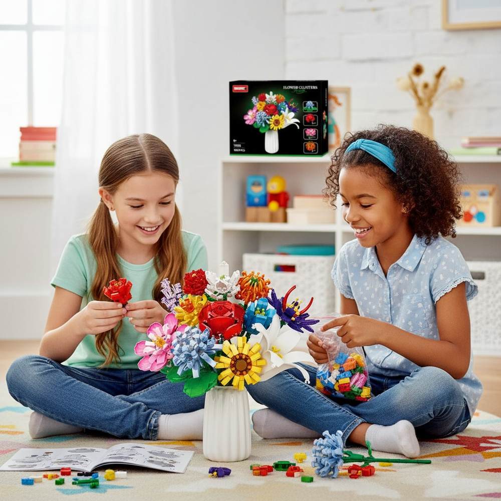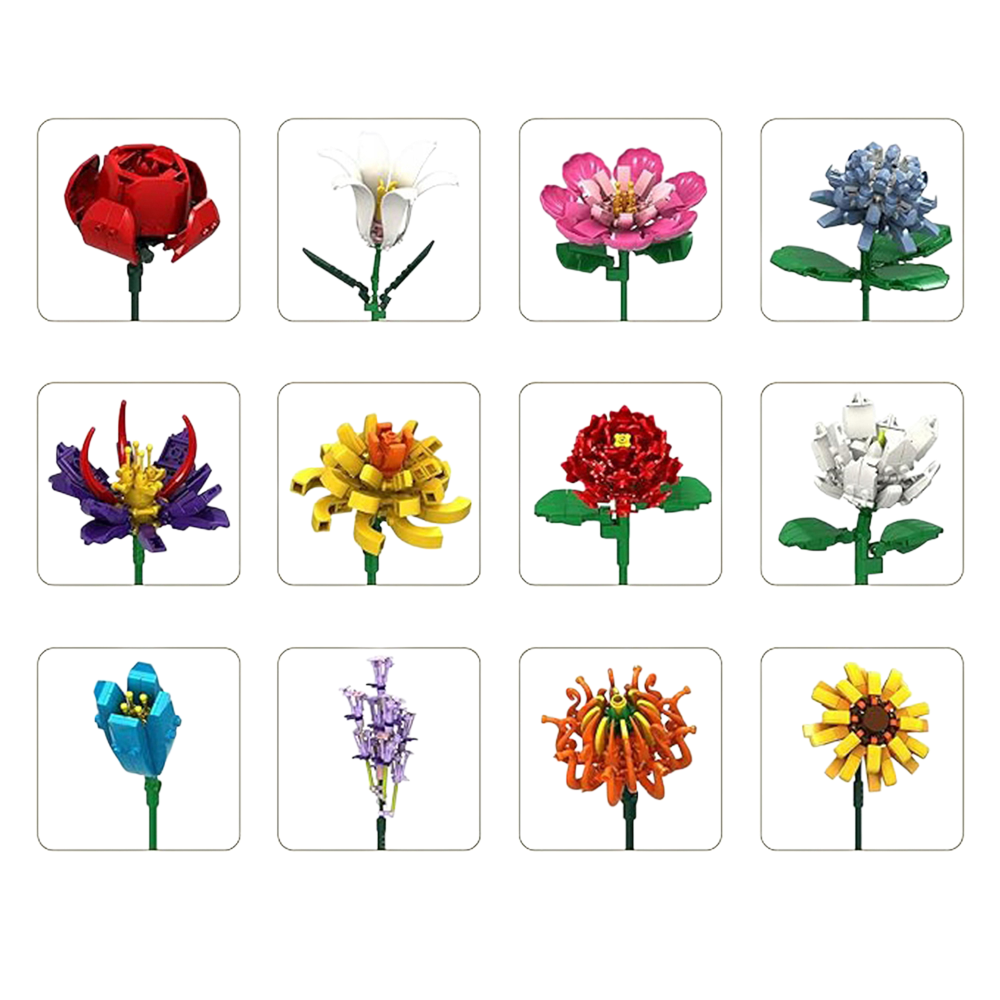 - Zestaw 1064 elementów – klocki konstrukcyjne „Duży Bukiet 12 różnych kwiatów” (Róża, Lilia, Orchidea i inne) dla dzieci od 6 lat. Kreatywna zabawa, dekoracja DIY, rozwój manualny i wyobraźni.