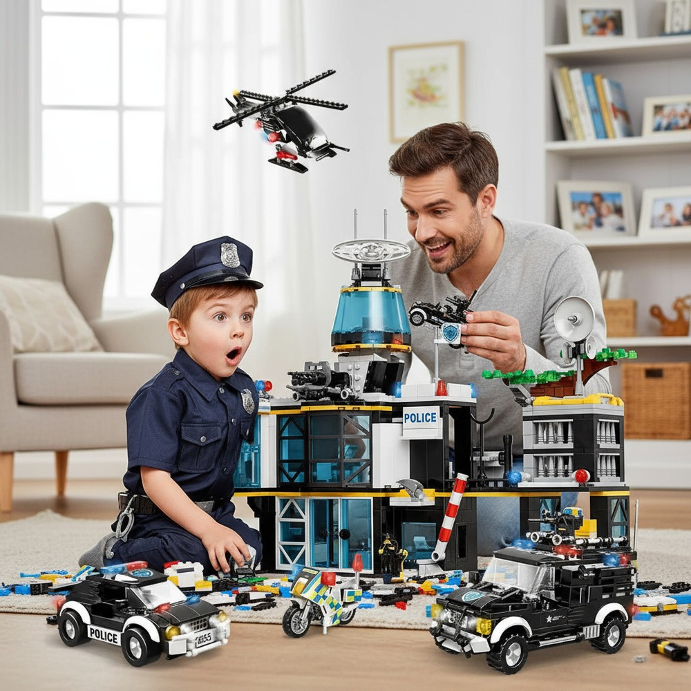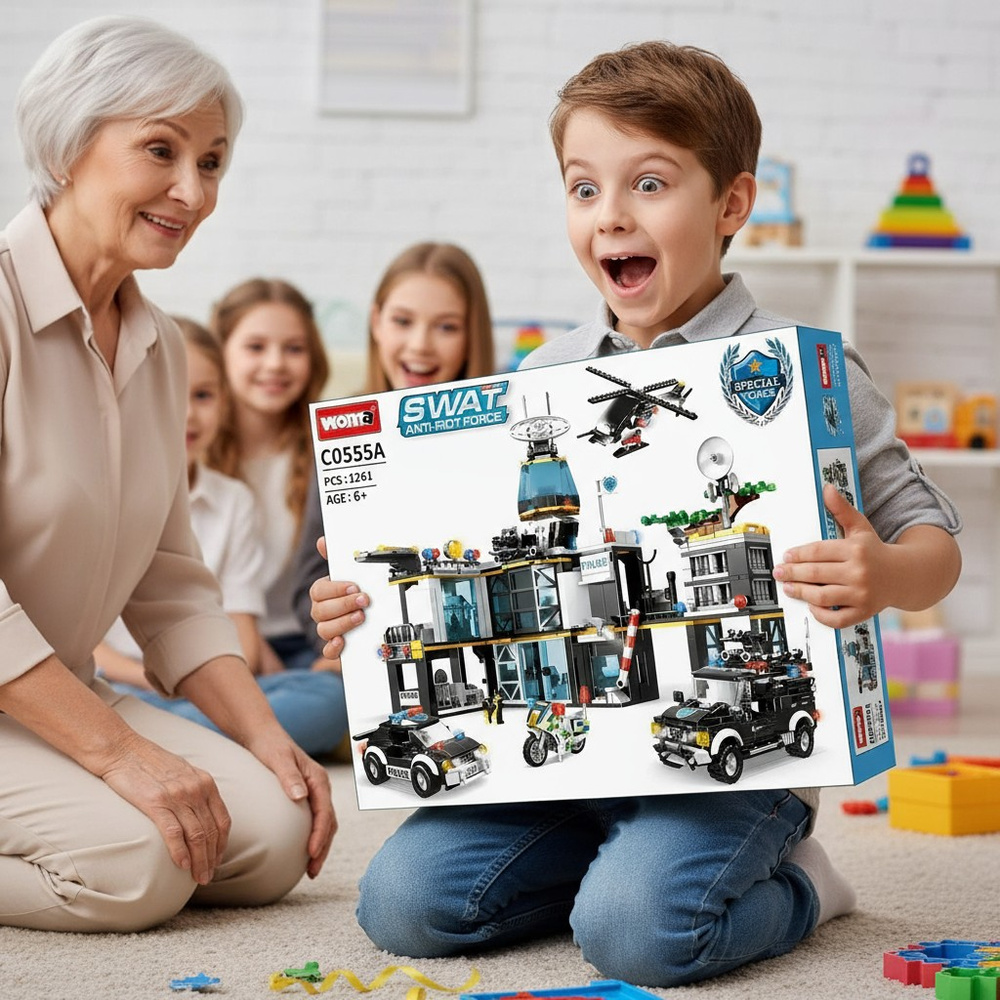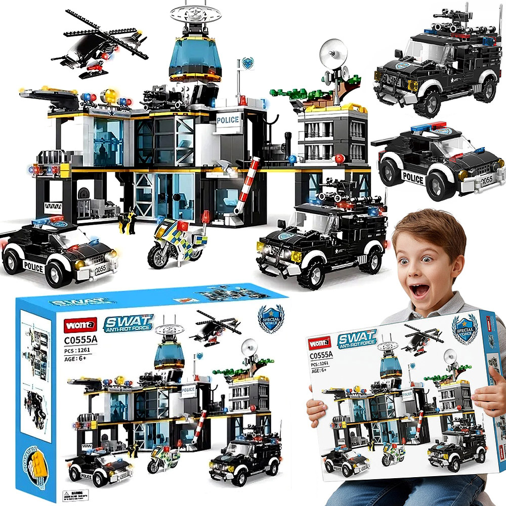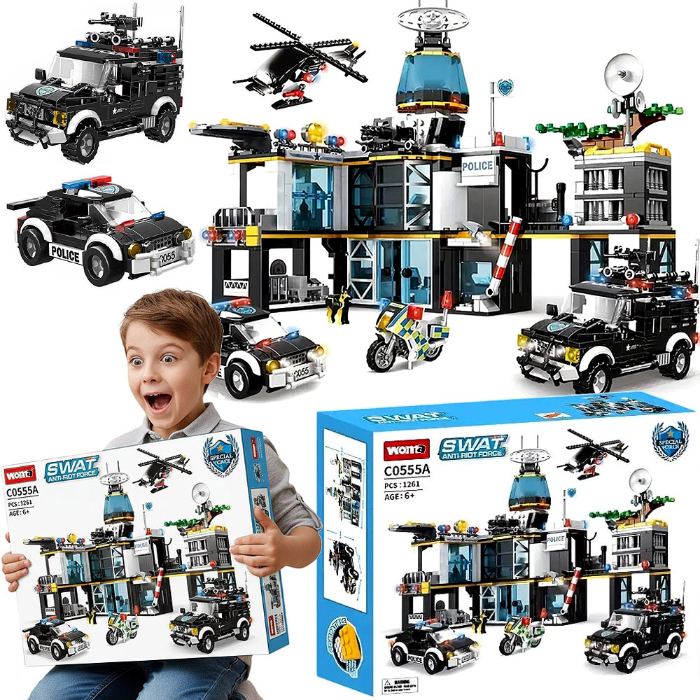- Zestaw klocków konstrukcyjnych „Policja” – 1261 elementów do budowy komisariatu, radiowozu i pojazdów. Kompatybilne z markowymi klockami, dla dzieci od 6 lat. Rozwija kreatywność i logiczne myślenie.