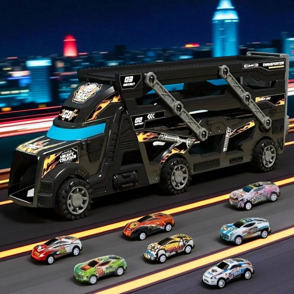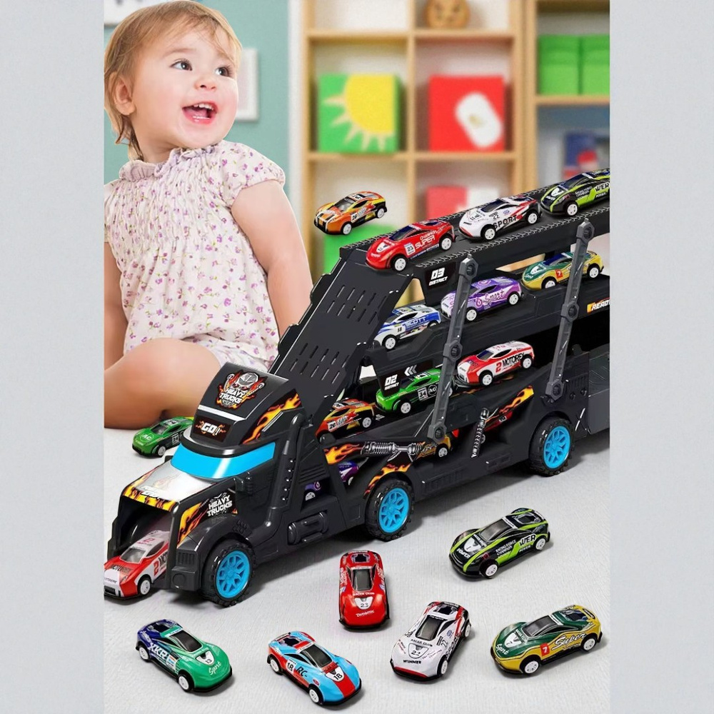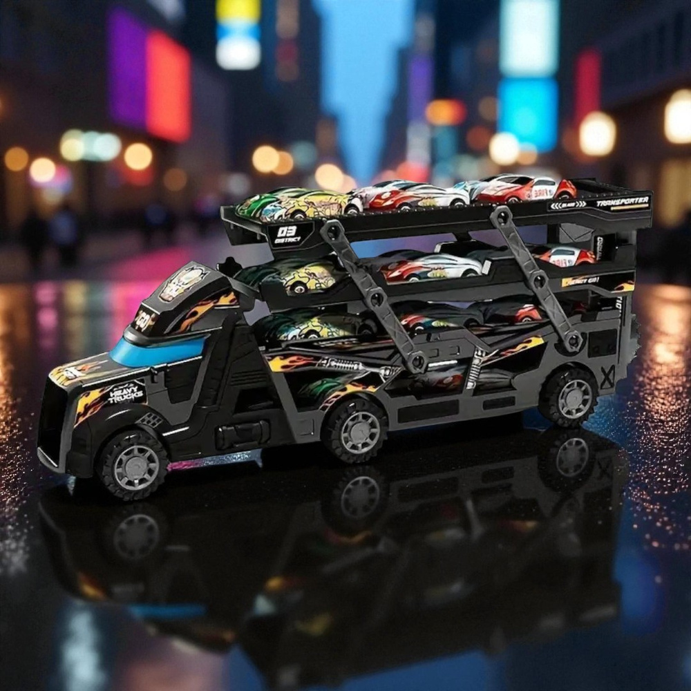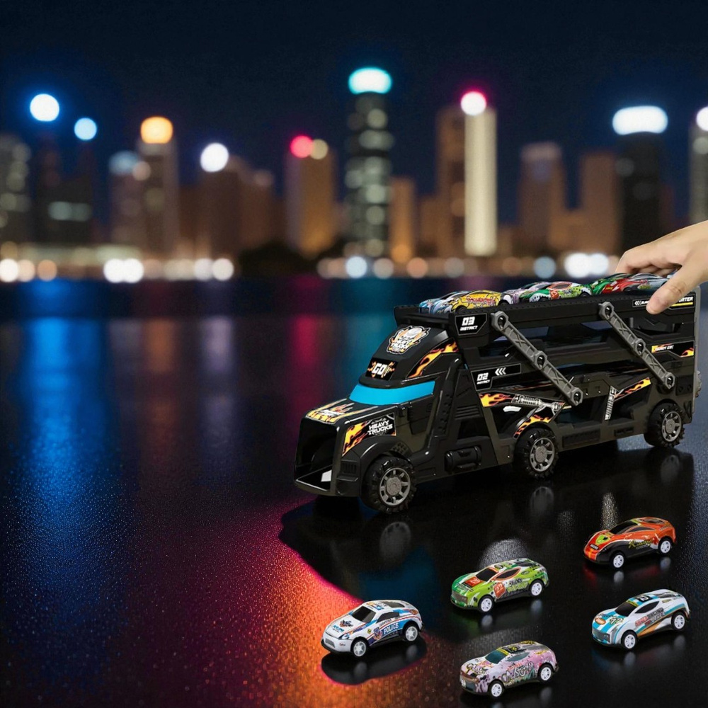 Ten zestaw DUŻA CIĘŻARÓWKA TIR LAWETA + 6 AUTEK RESORAKI z WYRZUTNIĄ to zabawka, która zachwyci każde dziecko! To nie tylko transporter samochodzików, ale pełnoprawny zestaw do zabawy – z trzema poziomami załadunku i dynamiczną wyrzutnią, dzięki której autka mogą ruszać w emocjonujące wyścigi!