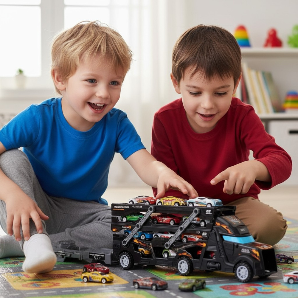 Zabawa lawetą i samochodzikami to nie tylko frajda, ale też rozwój motoryki, koordynacji i kreatywności. Dziecko może odgrywać różne scenki – transportować autka, przygotowywać wyścigi, używać wyrzutni lub układać pojazdy na poziomach naczepy. To doskonała forma nauki przez zabawę!