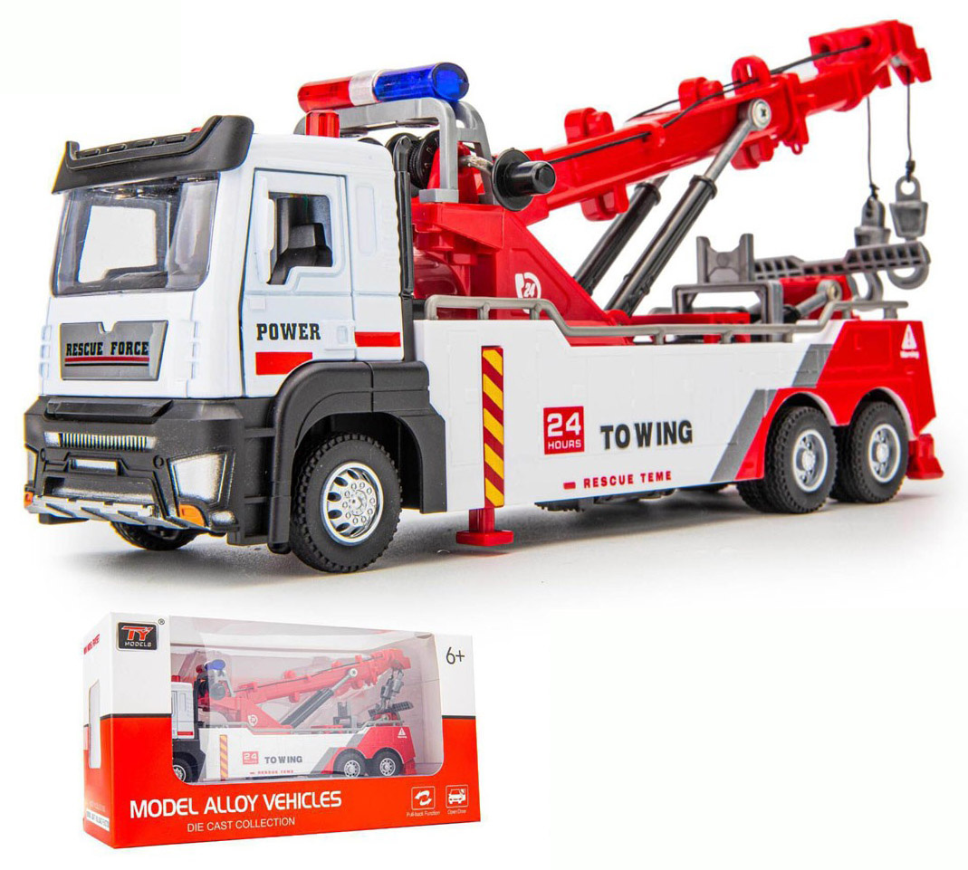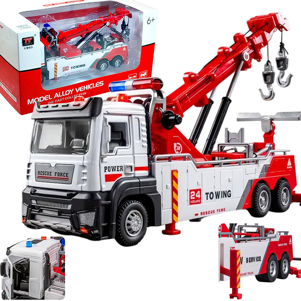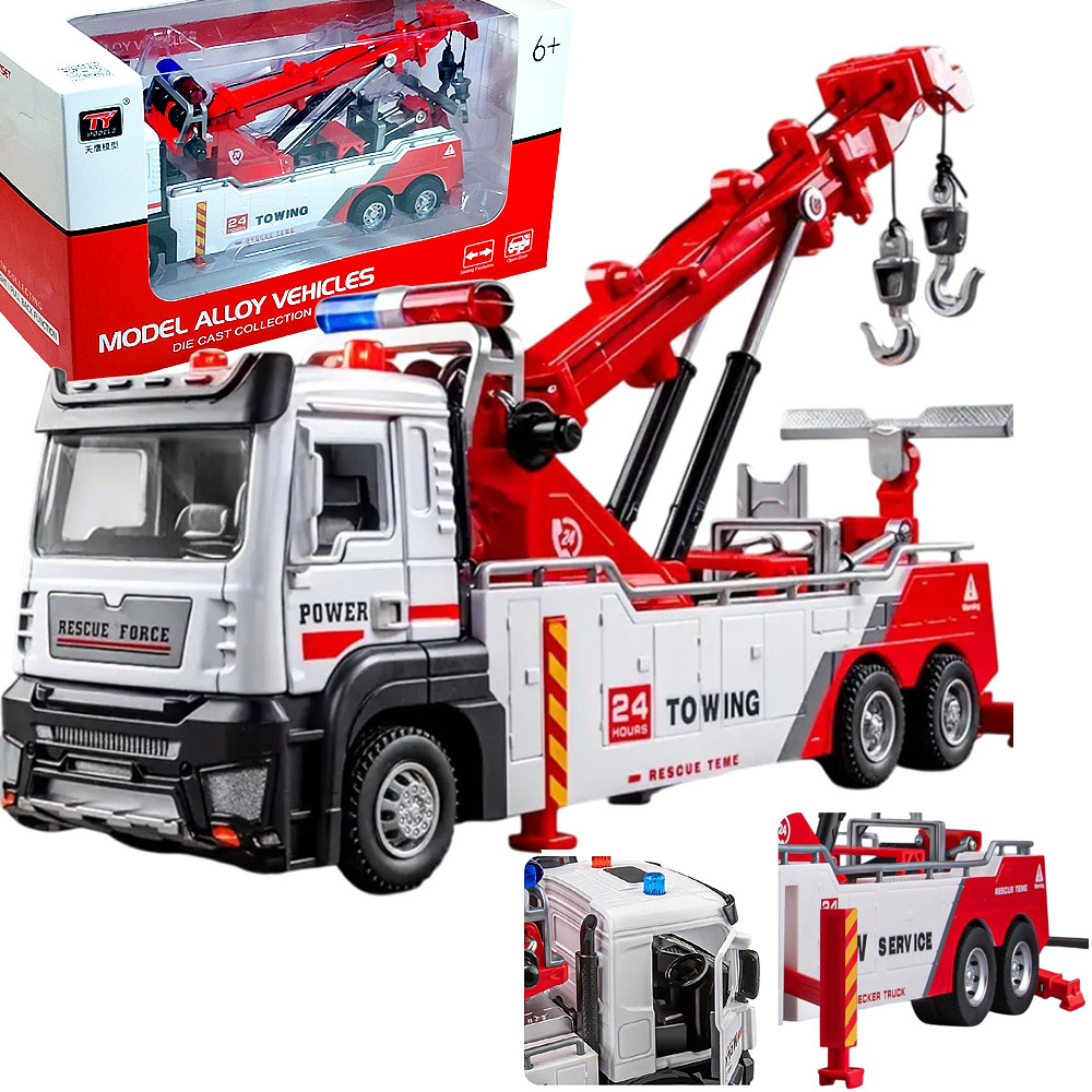 CIĘŻARÓWKA Z DŹWIGIEM METALOWA 1:18 LAWETA POMOC DROGOWA ŚWIATŁO DŹWIĘK