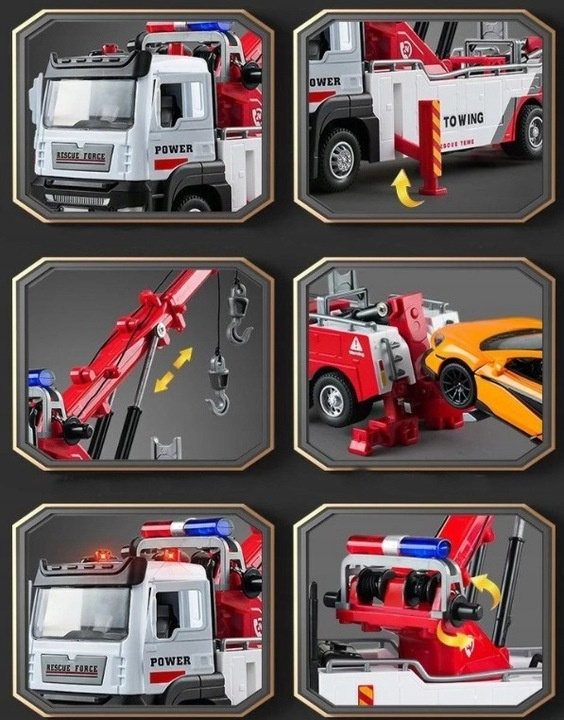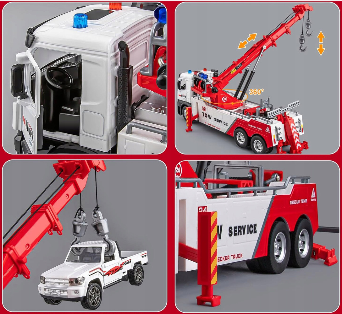 Otwierane drzwi i ruchome ramię dźwigu sprawiają, że model wygląda jak prawdziwy pojazd pomocy drogowej.