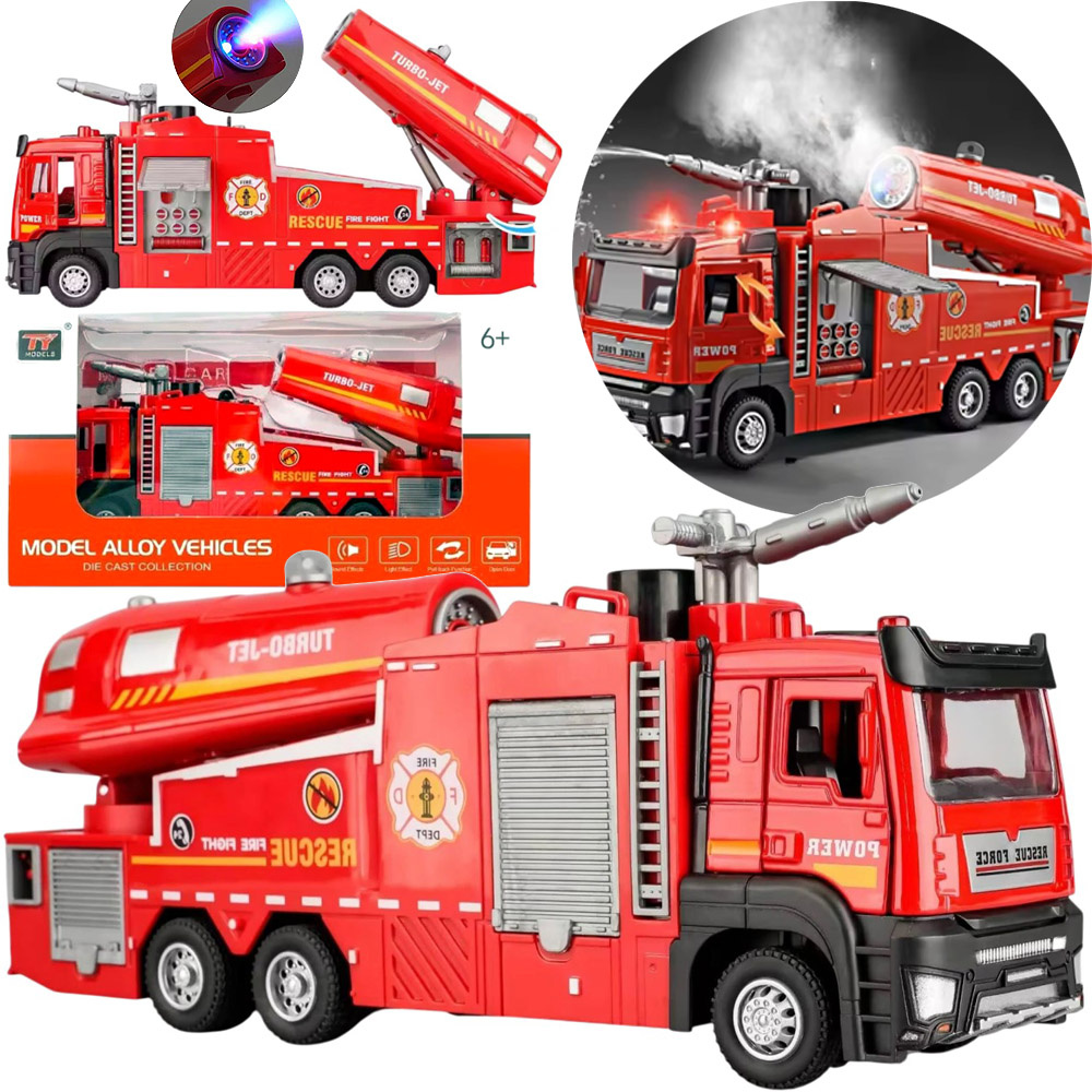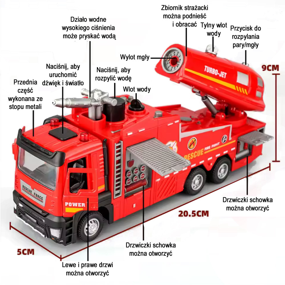 - Realistyczny samochód strażacki z efektami świetlnymi i dźwiękowymi. Obracany zbiornik, działko wodne, otwierane drzwiczki i schowki. Idealny prezent dla małego strażaka!