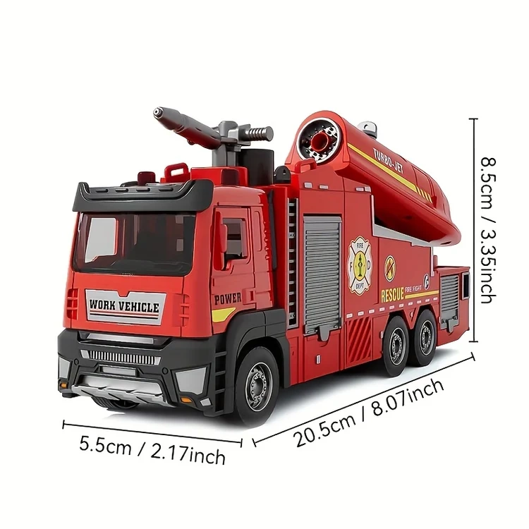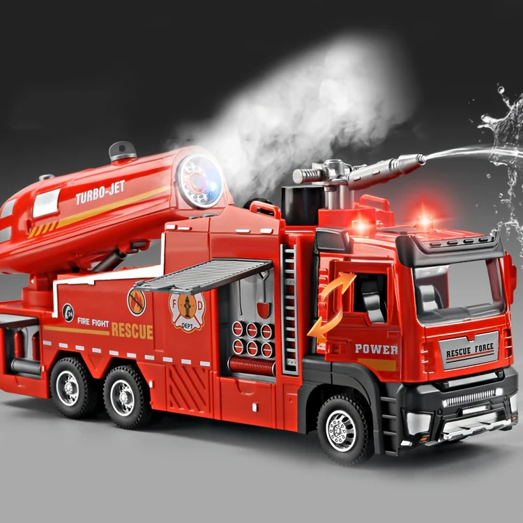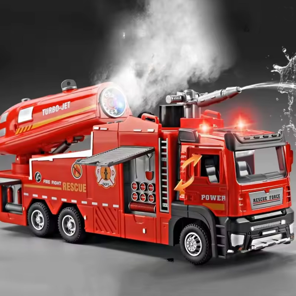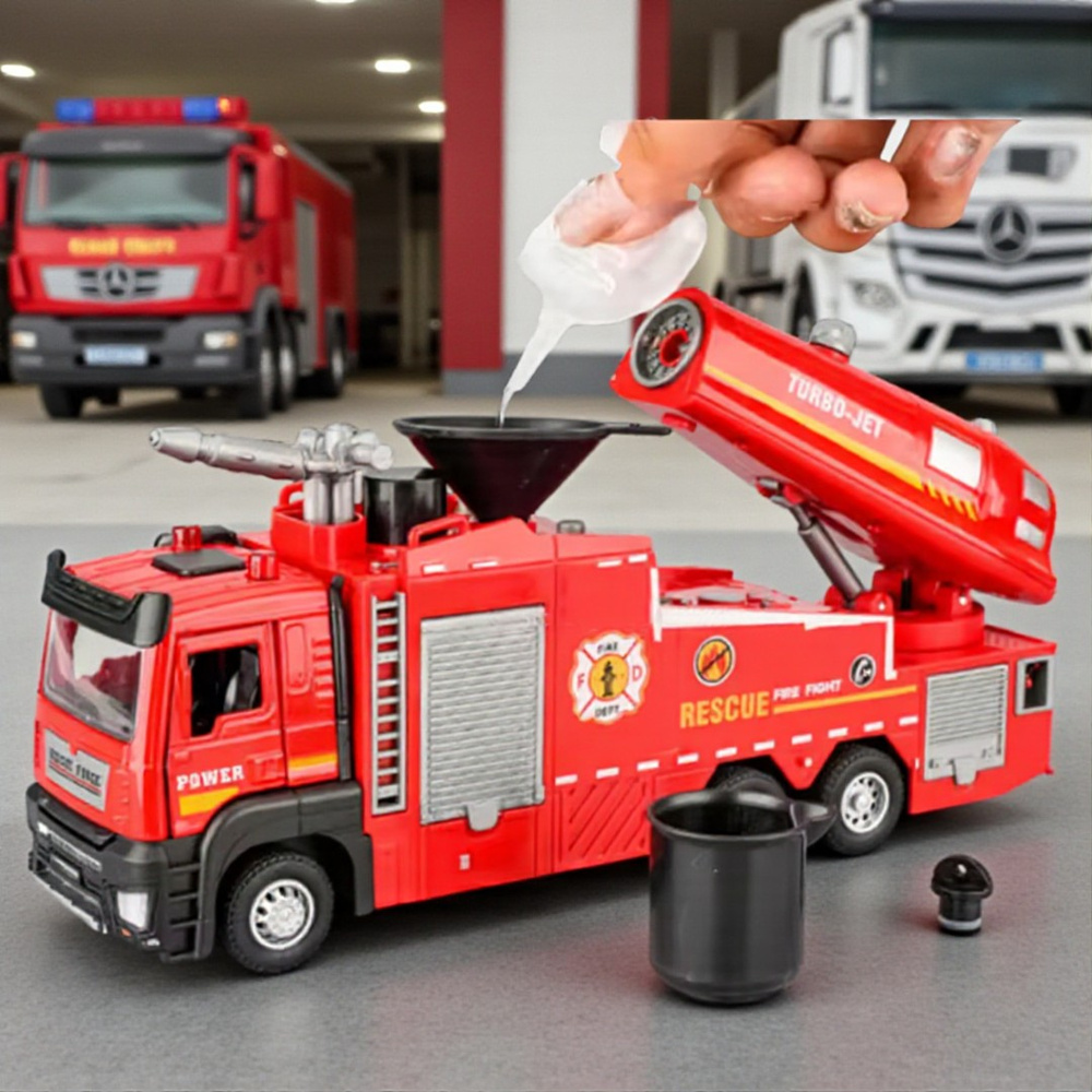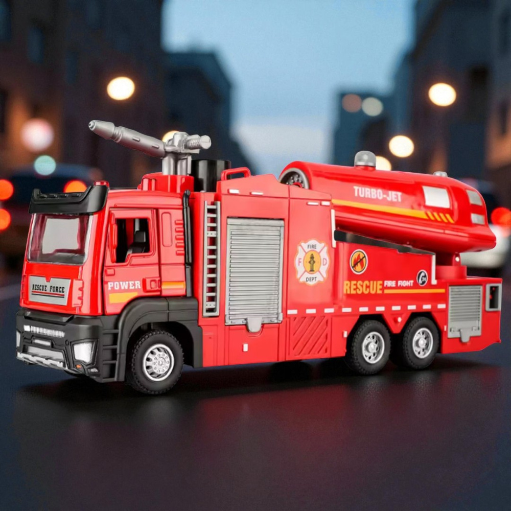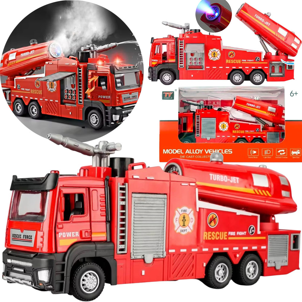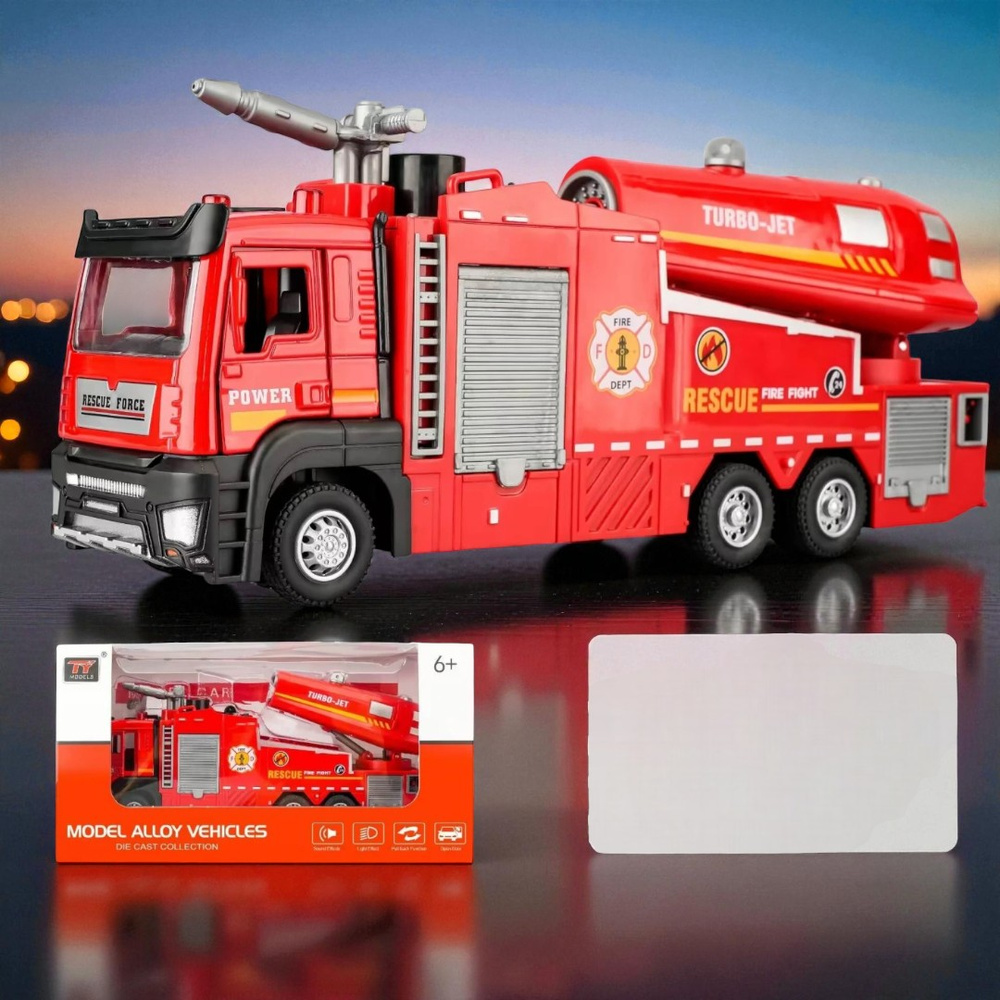 Model wykonany jest z połączenia metalu i wytrzymałego tworzywa, co gwarantuje trwałość oraz bezpieczną zabawę. Samochód posiada działo wodne, które naprawdę pryska wodą, podnoszony i obracany zbiornik, a także otwierane drzwiczki oraz realistyczne efekty świetlne i dźwiękowe.