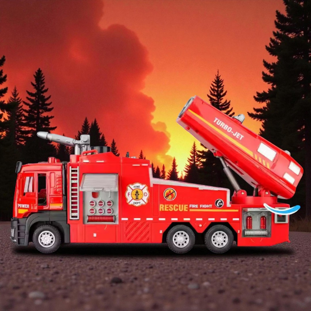 - Efekty dźwiękowe i świetlne – po naciśnięciu przycisku uruchamiają się realistyczne syreny strażackie i światła ostrzegawcze.
