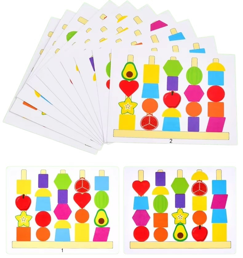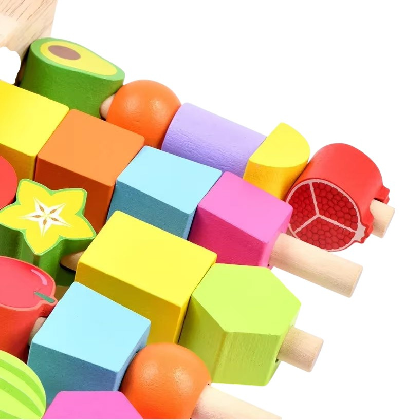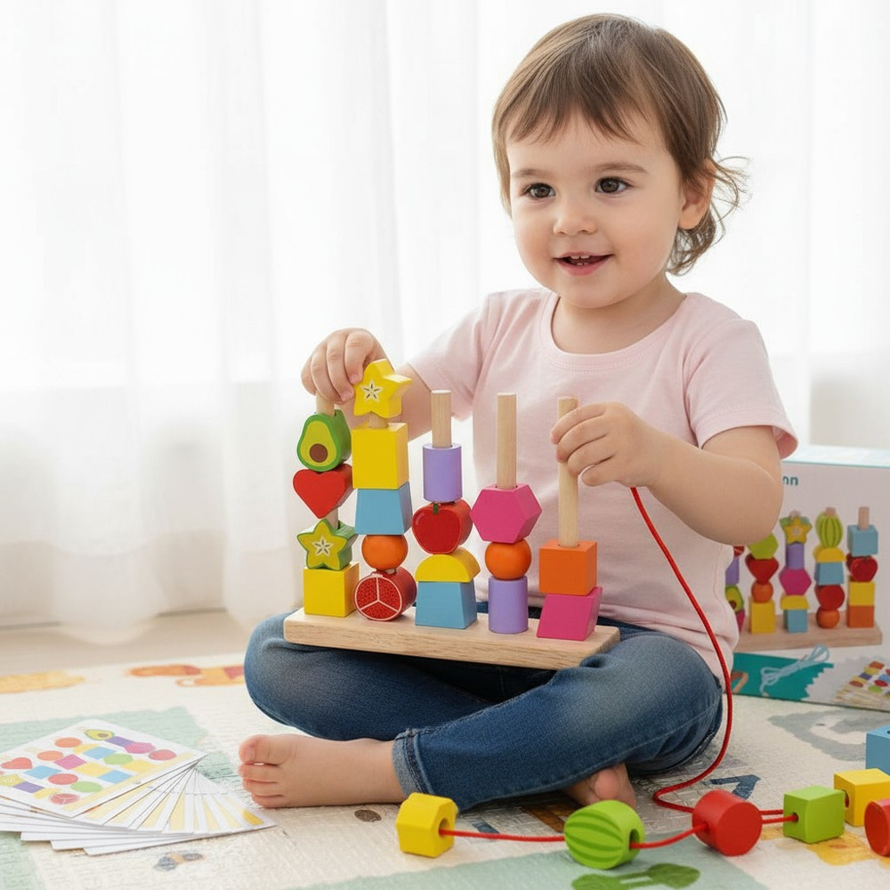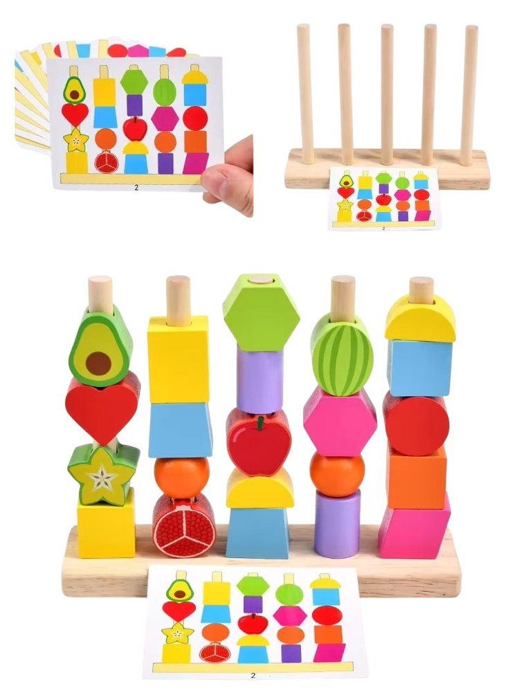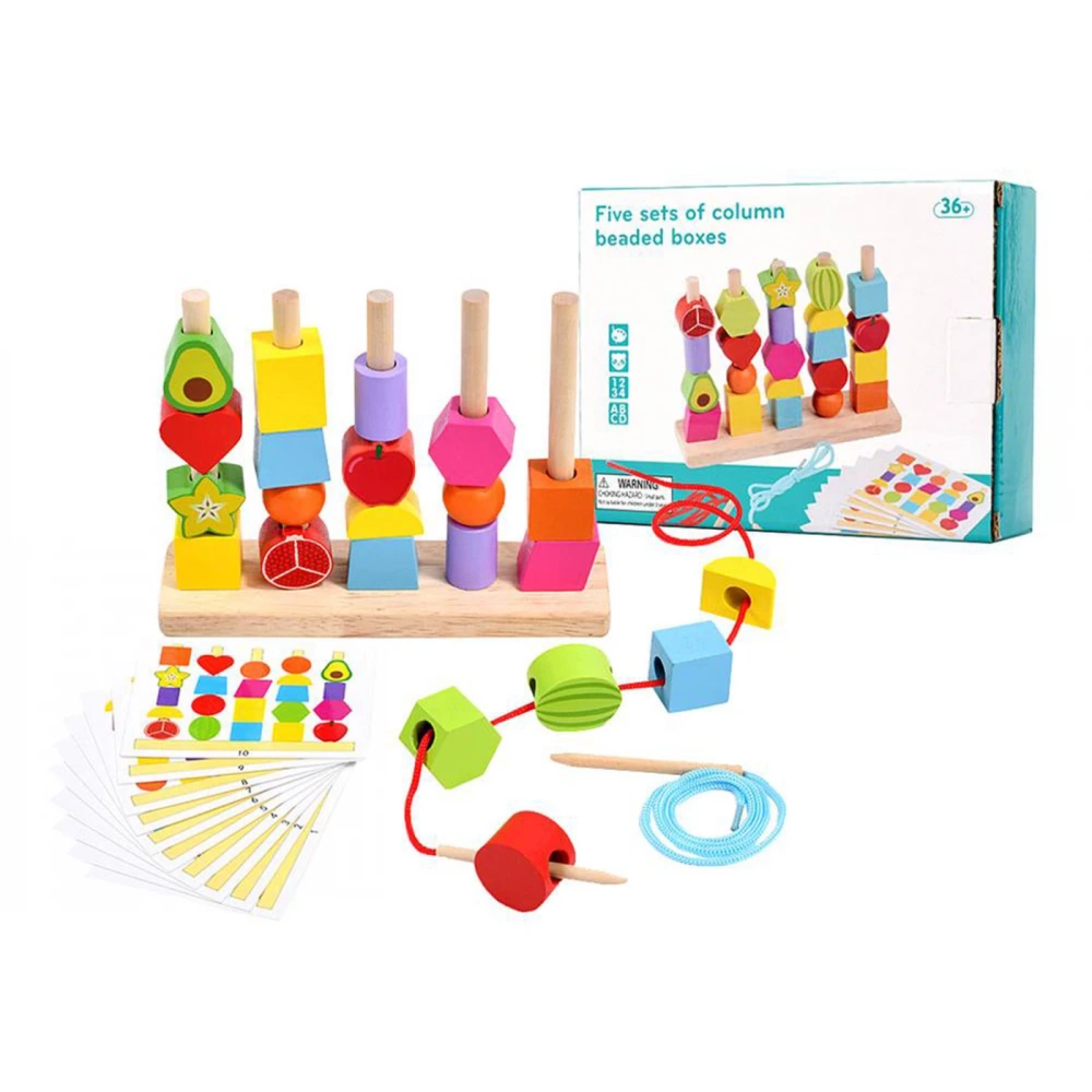 Zestaw edukacyjny z naturalnego drewna, łączący funkcje układanki, sortera i zestawu do nawlekania. Składa się z 25 kolorowych klocków w różnych kształtach, podstawki z palikami oraz dwóch sznurków do nawlekania. Zabawka rozwija koordynację ręka-oko, zdolności manualne, logiczne myślenie i koncentrację. Pomaga w nauce kolorów, kształtów i sekwencji.