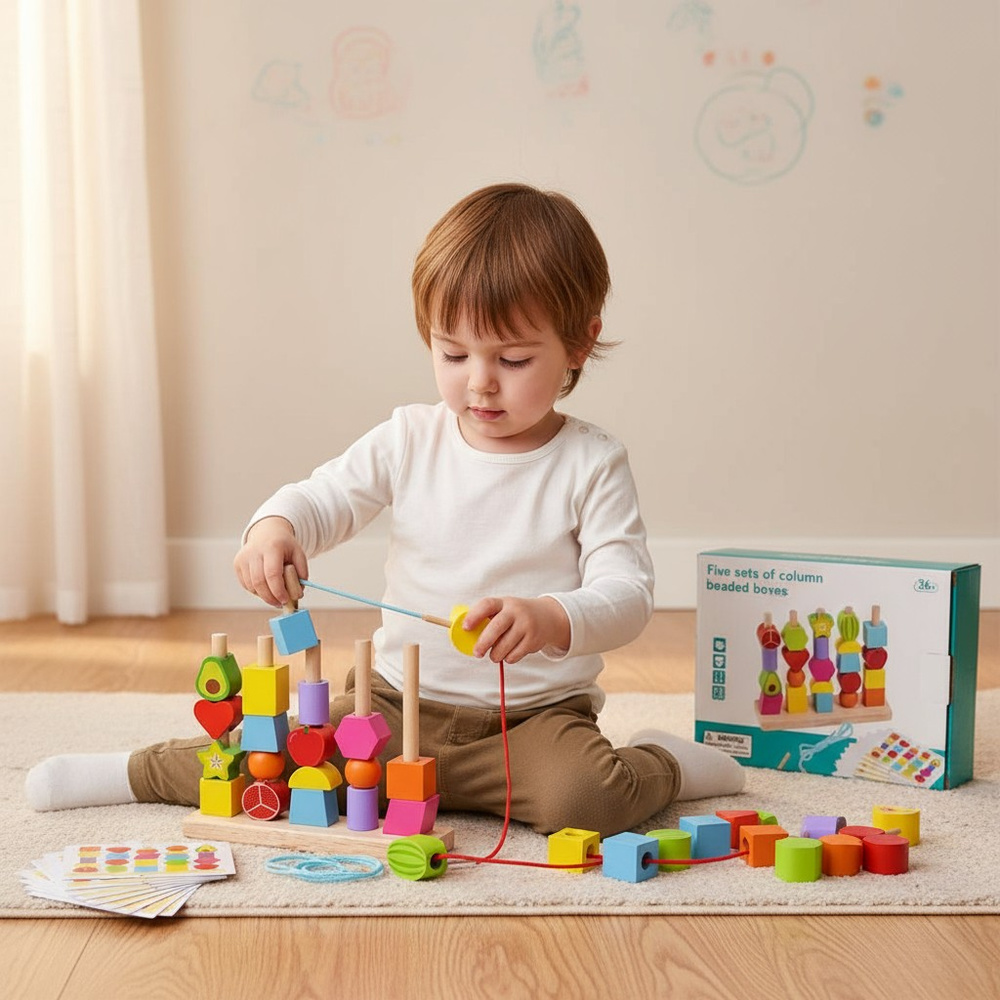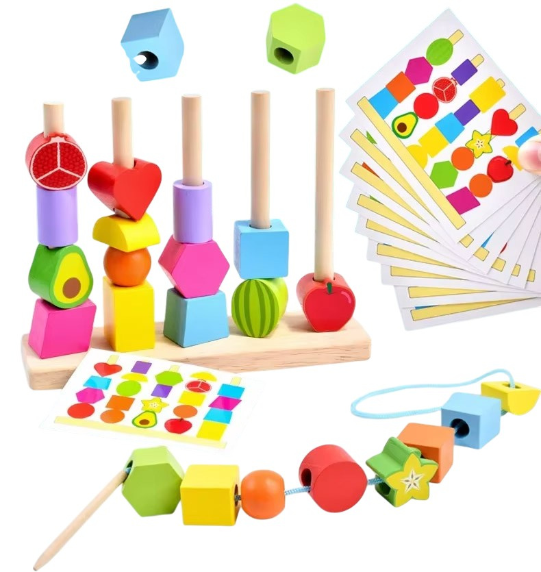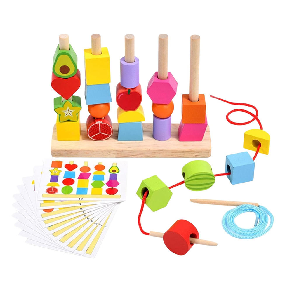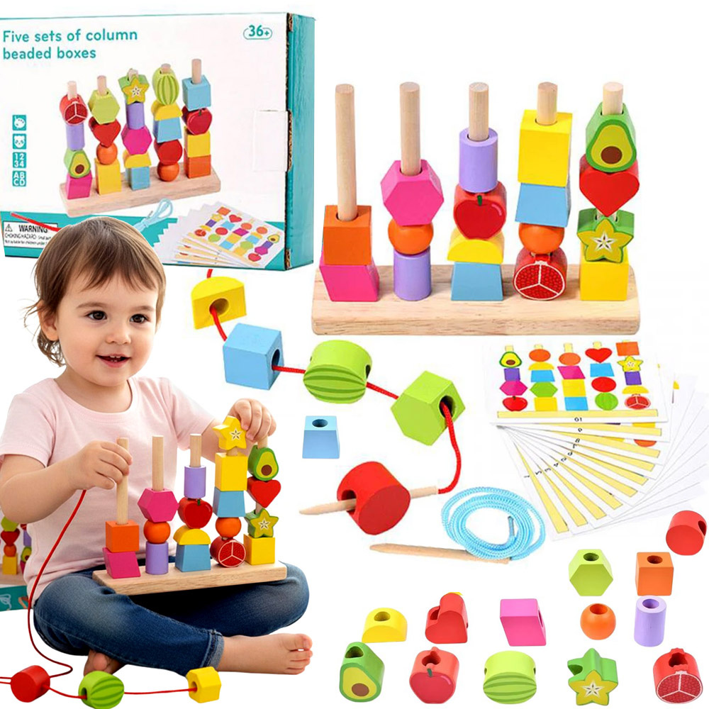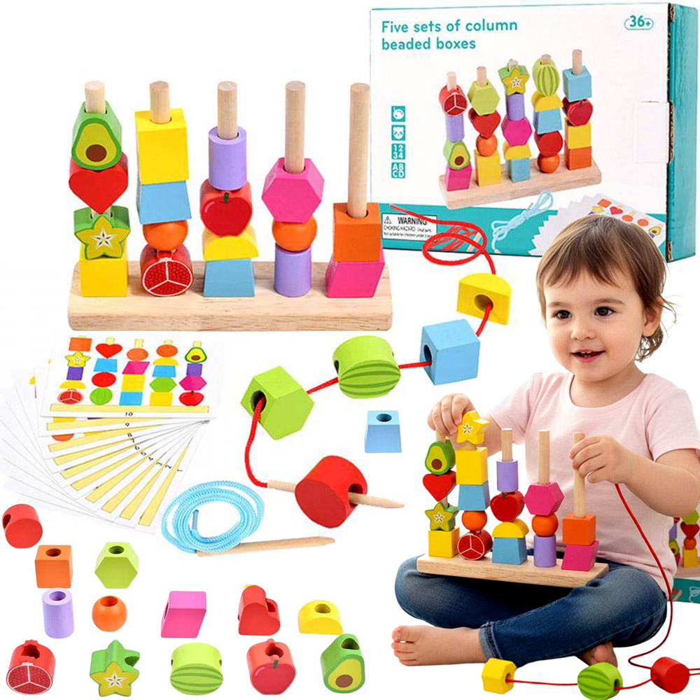 - Odkryj zestaw 25 drewnianych klocków : układanka edukacyjna, nawlekanie, sortowanie, paliki, sznurki – wspiera rozwój motoryki, percepcji, kształtów i kolorów. Dla dzieci 3+.