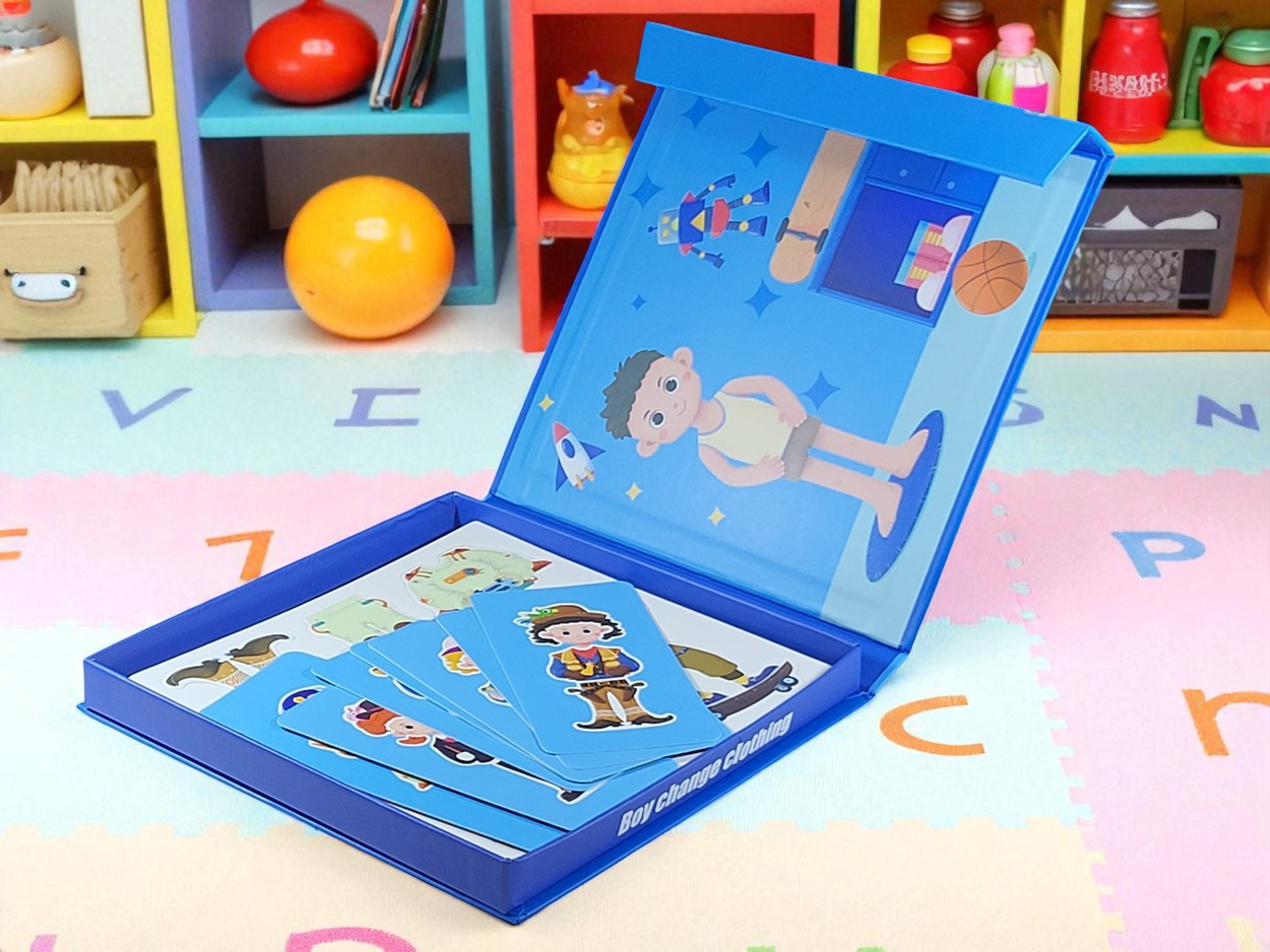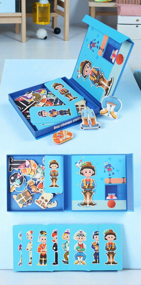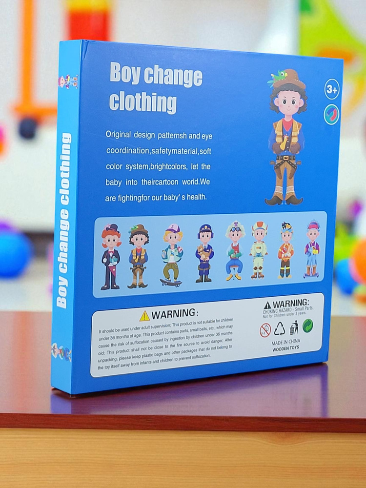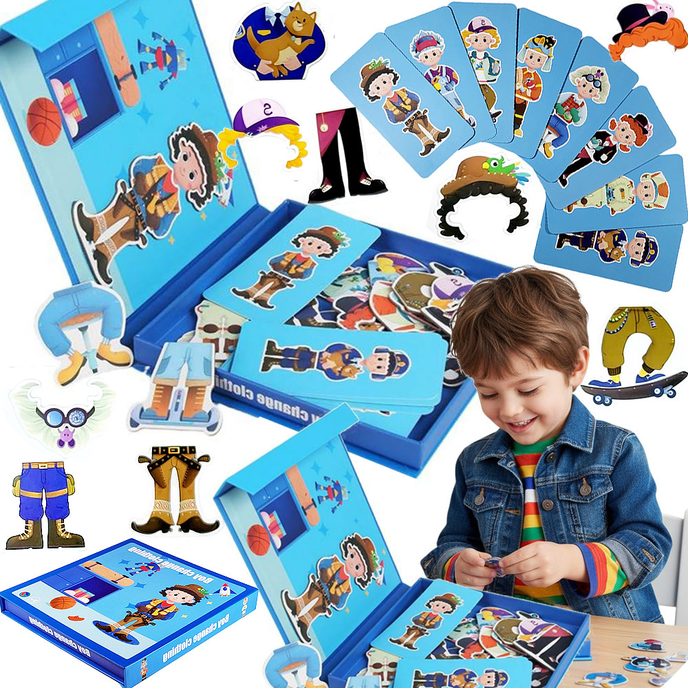 Zestaw składa się z magnetycznej planszy chłopca oraz zestawu magnesów – ubrań i dodatków, takich jak spodnie, koszulki, kurtki, buty, nakrycia głowy, okulary czy plecaki. Dziecko może przebierać postać, dopasowując stroje do różnych sytuacji: szkoła, spacer, sport, zima czy lato.