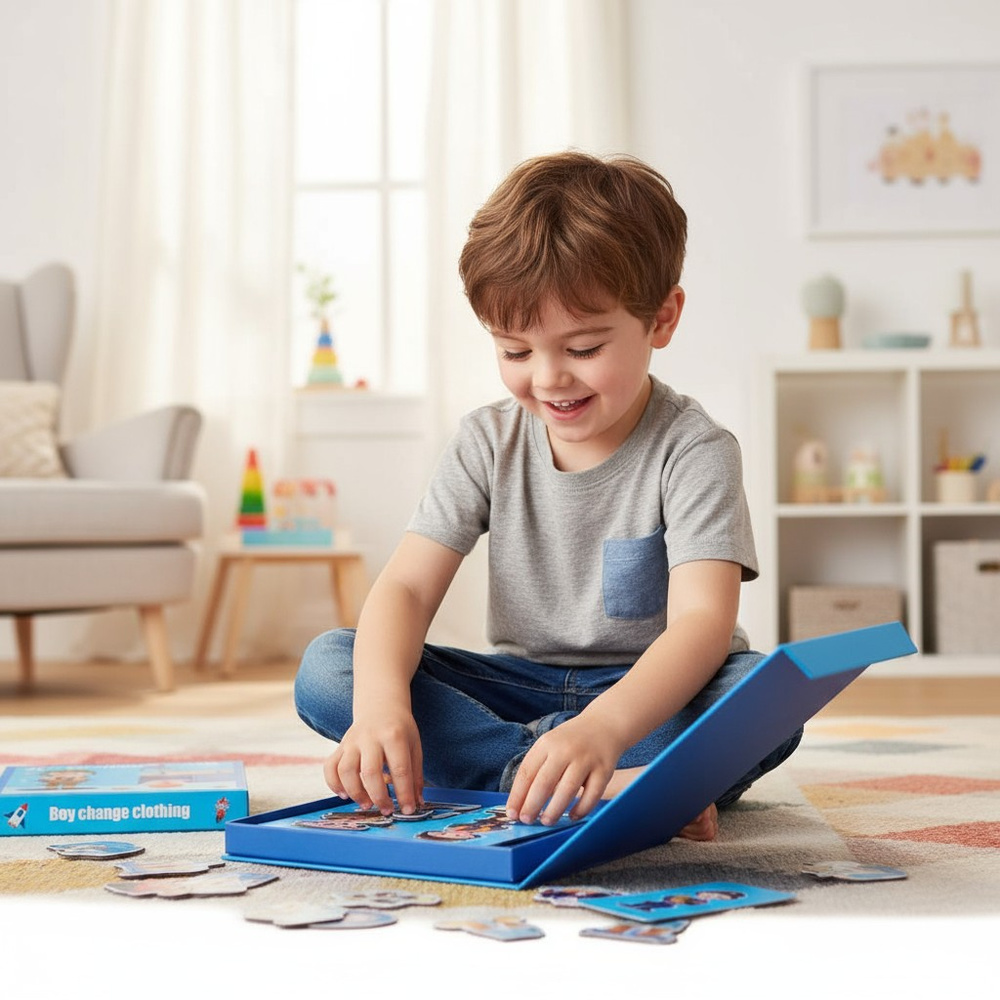 • Kreatywna układanka magnetyczna „Ubieranka Chłopca” – zestaw puzzli i magnesów: figurka chłopca, baza + mnóstwo elementów garderoby, fryzur i dodatków. Rozwija manualnie, kreatywność, modę i wyobraźnię. Idealny prezent dla dzieci od 3 lat.