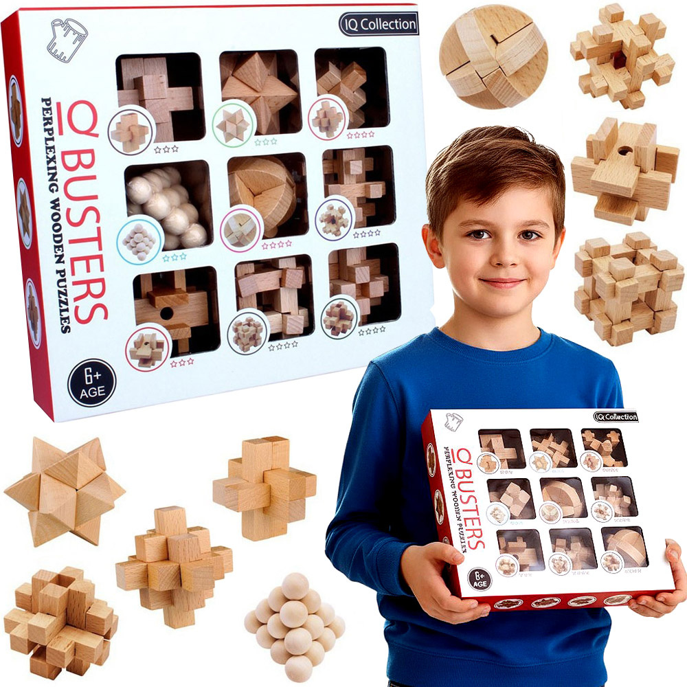 Zestaw 9 Łamigłówek Drewnianych IQ Busters Kostka Zagadki Logiczne Klocki