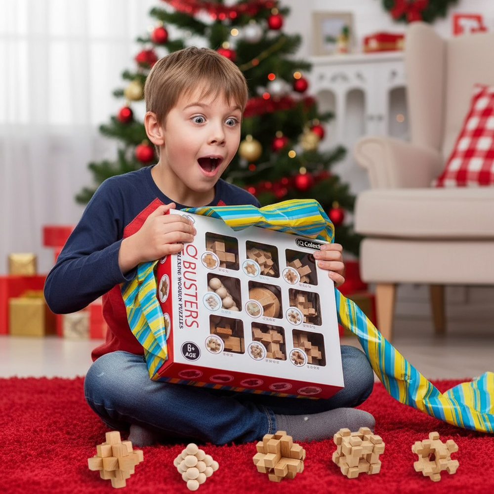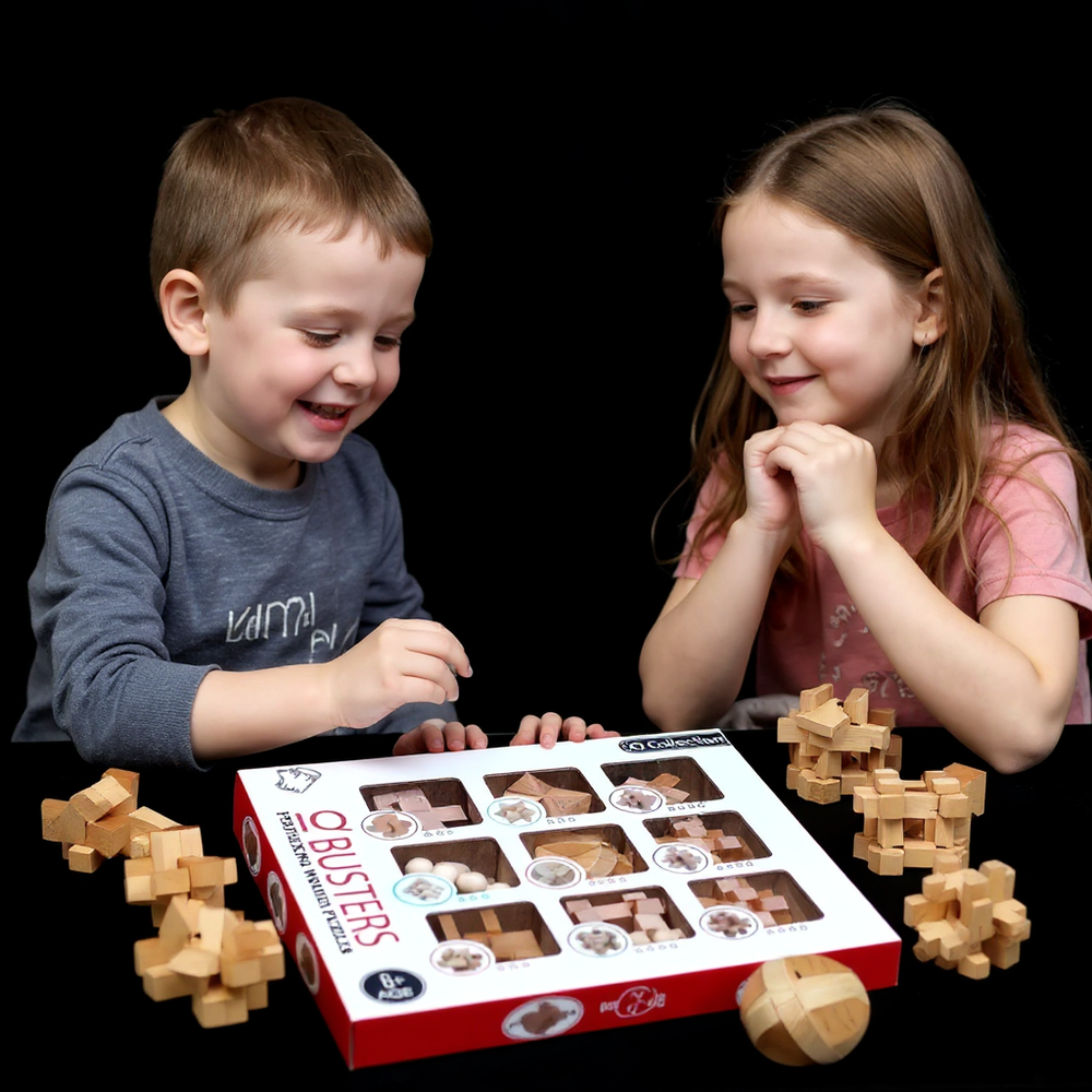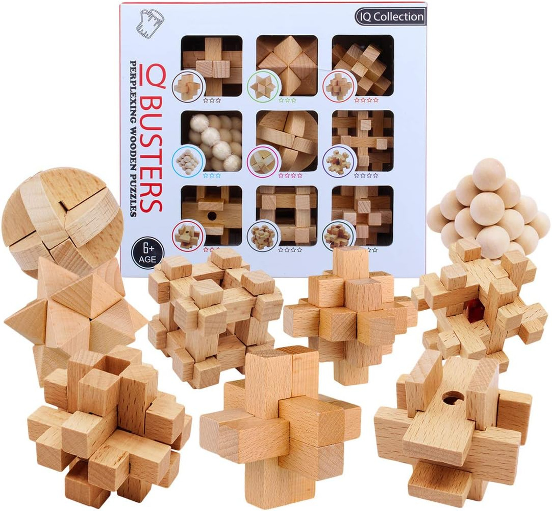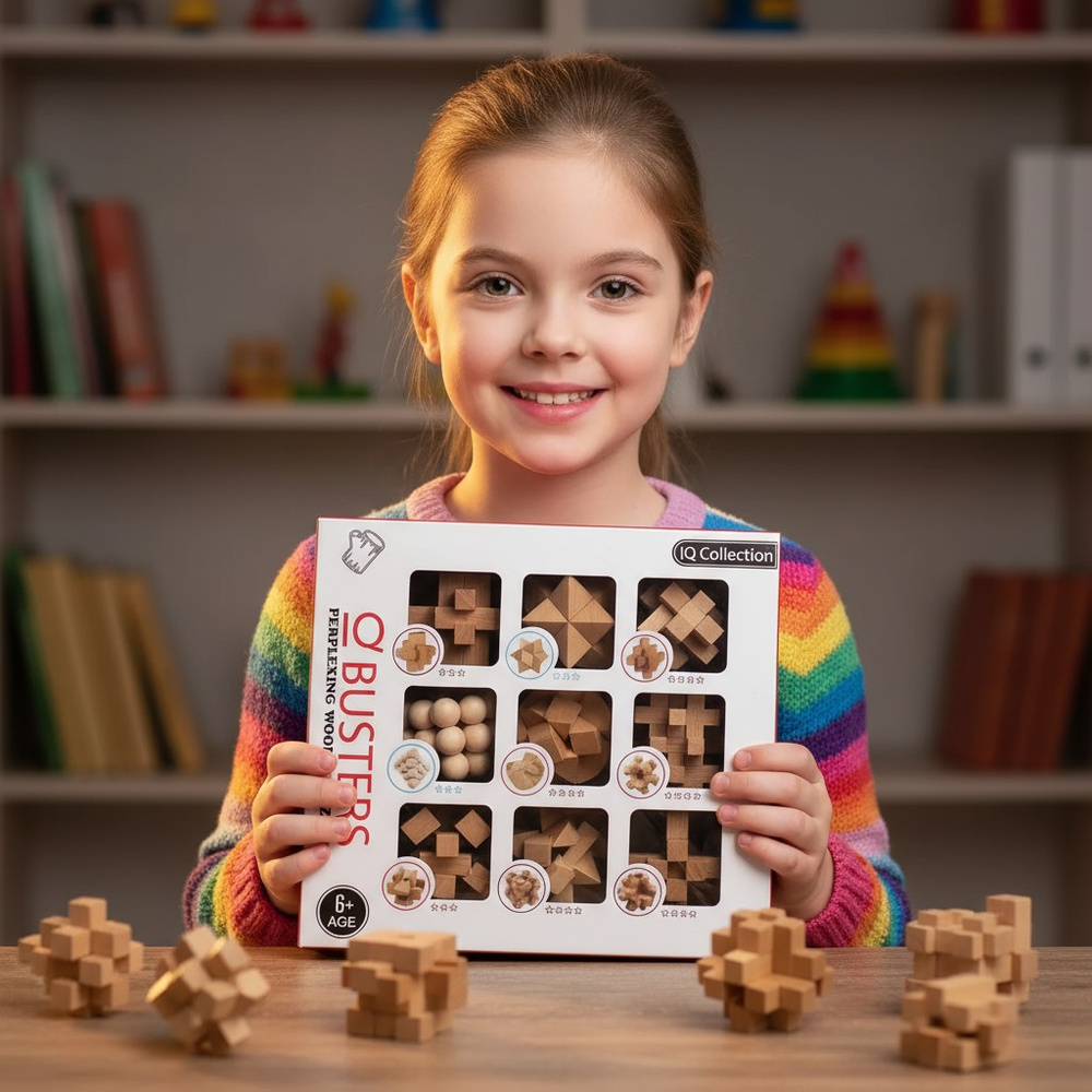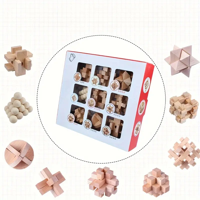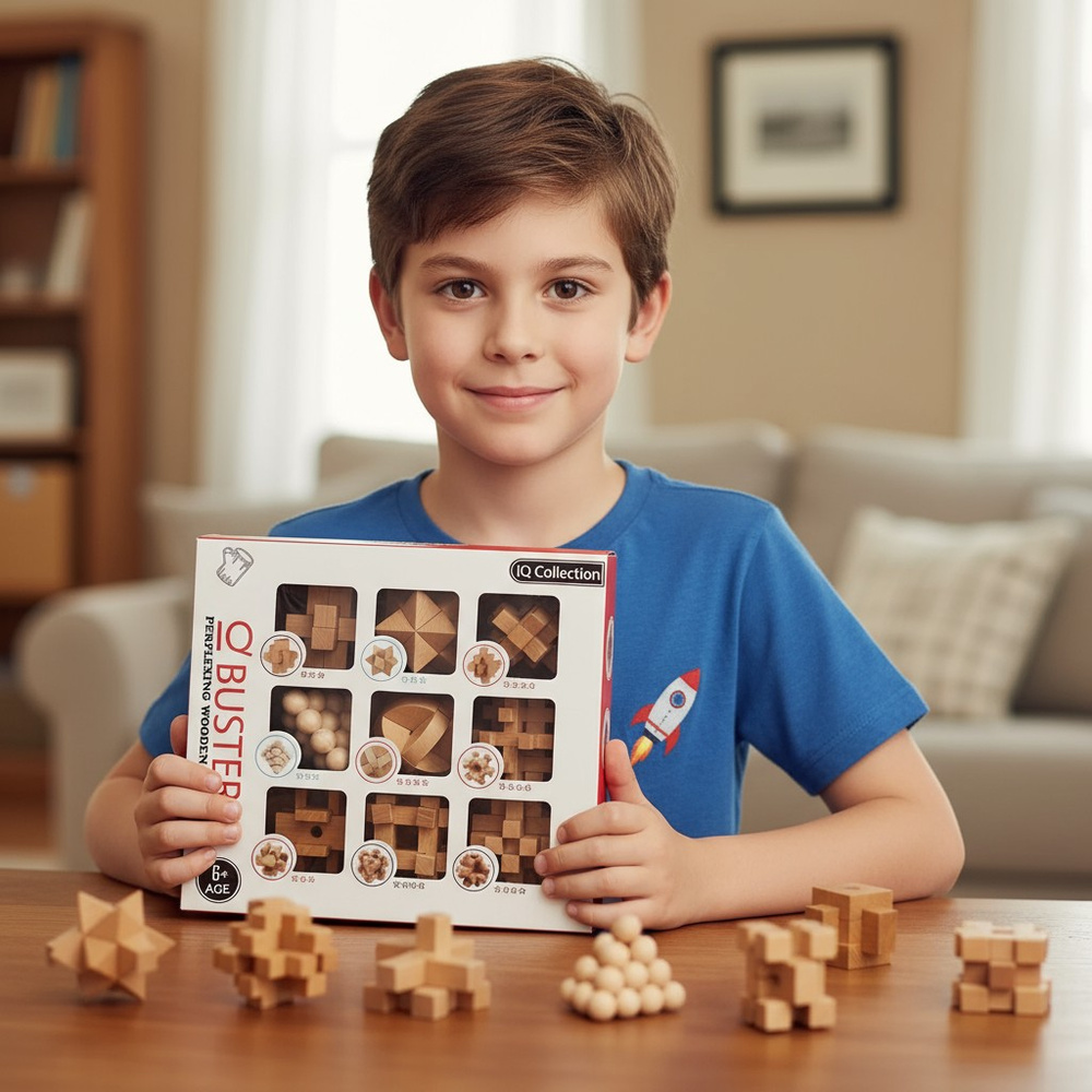 - Zestaw 9 drewnianych łamigłówek 3D IQ (9-w-1) z naturalnego drewna – rozwija logiczne myślenie, zdolności manualne i wyobraźnię przestrzenną. Idealny prezent dla dzieci od 6 lat i dla dorosłych miłośników zagadek.