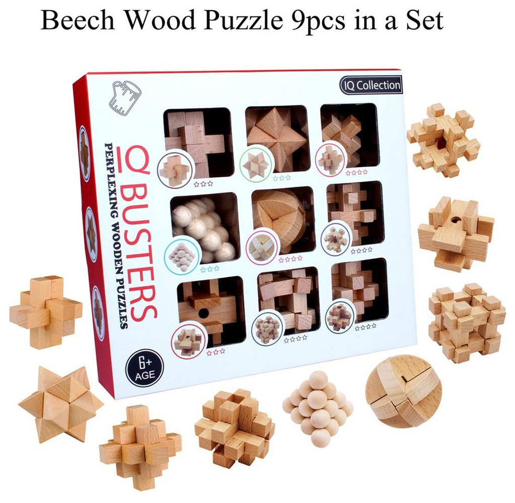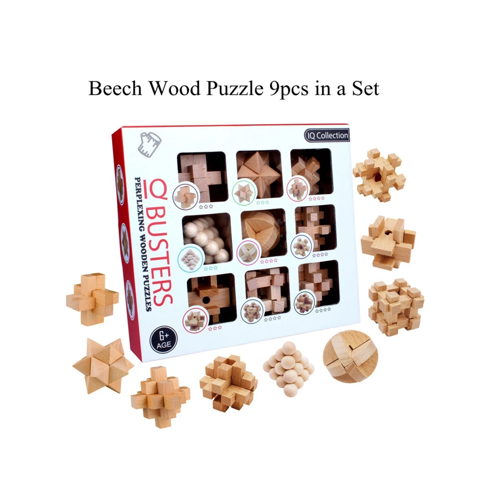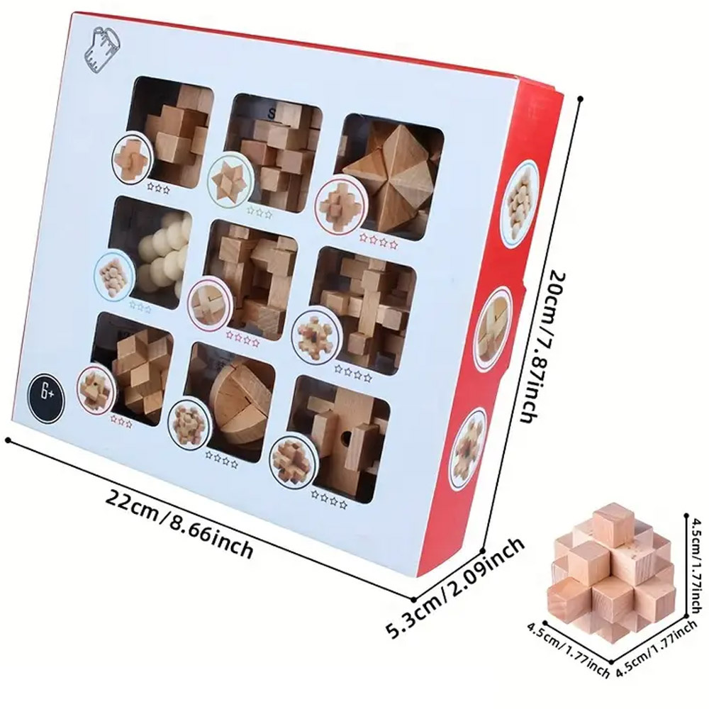 Drewniane Łamigłówki IQ 9 w 1 – Zestaw Logicznych Zagadek 3D dla Dzieci i Dorosłych