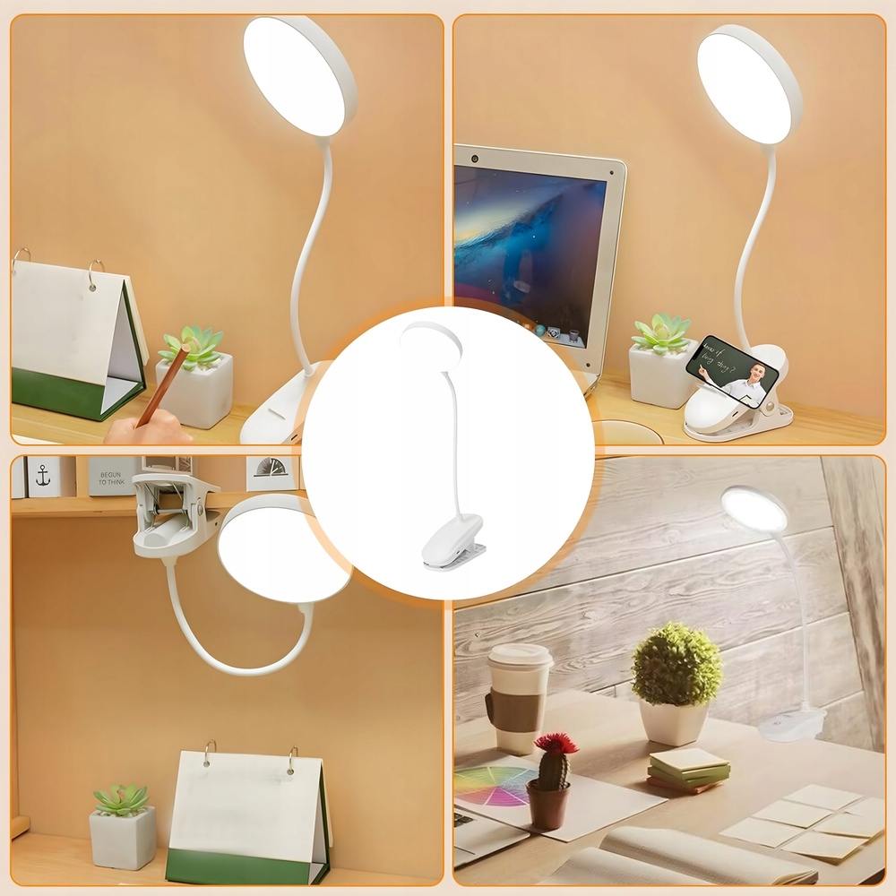 Lampka biurkowa z klipsem, przenośna lampka do czytania z możliwością ładowania przez USB i regulacją jasności, odpowiednia do czytania i nauki