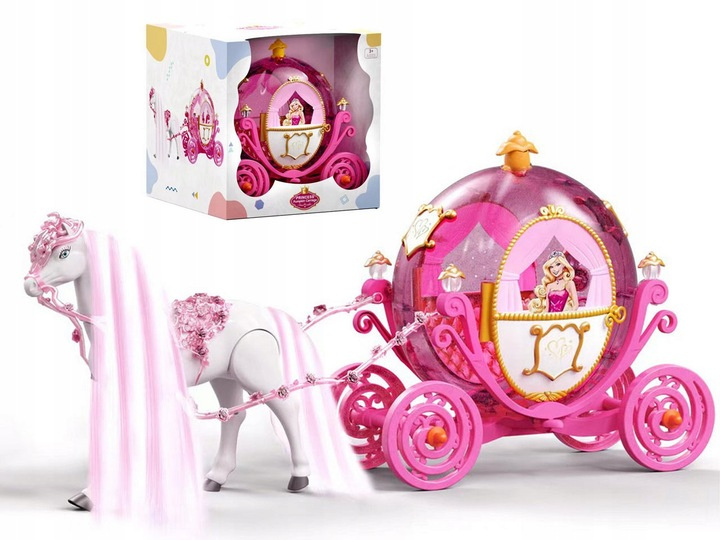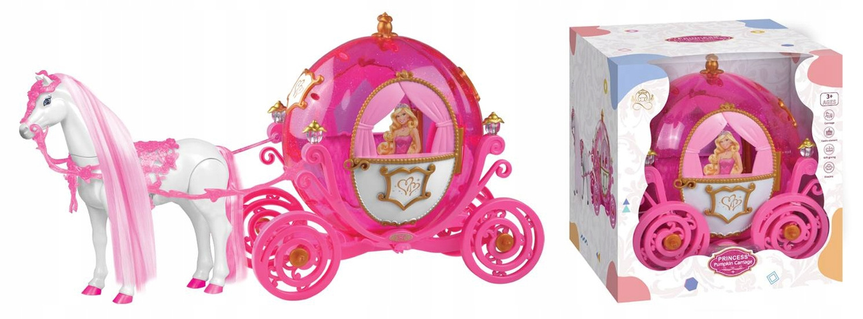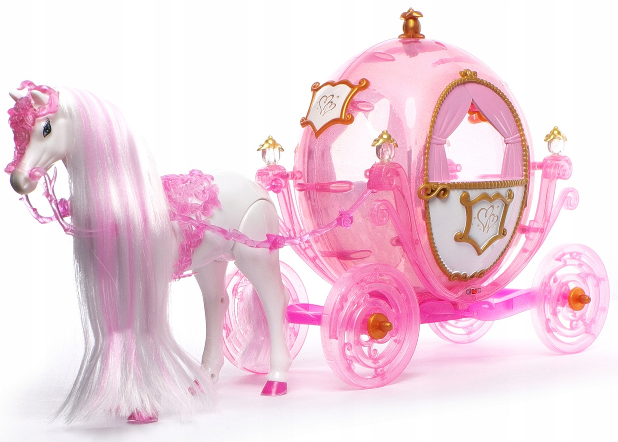 - Kolorystyka: różowo-złota karoca, biały koń z różową grzywą