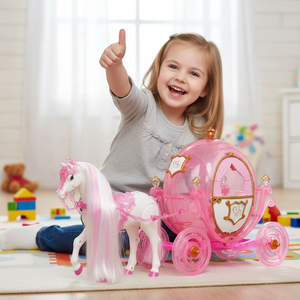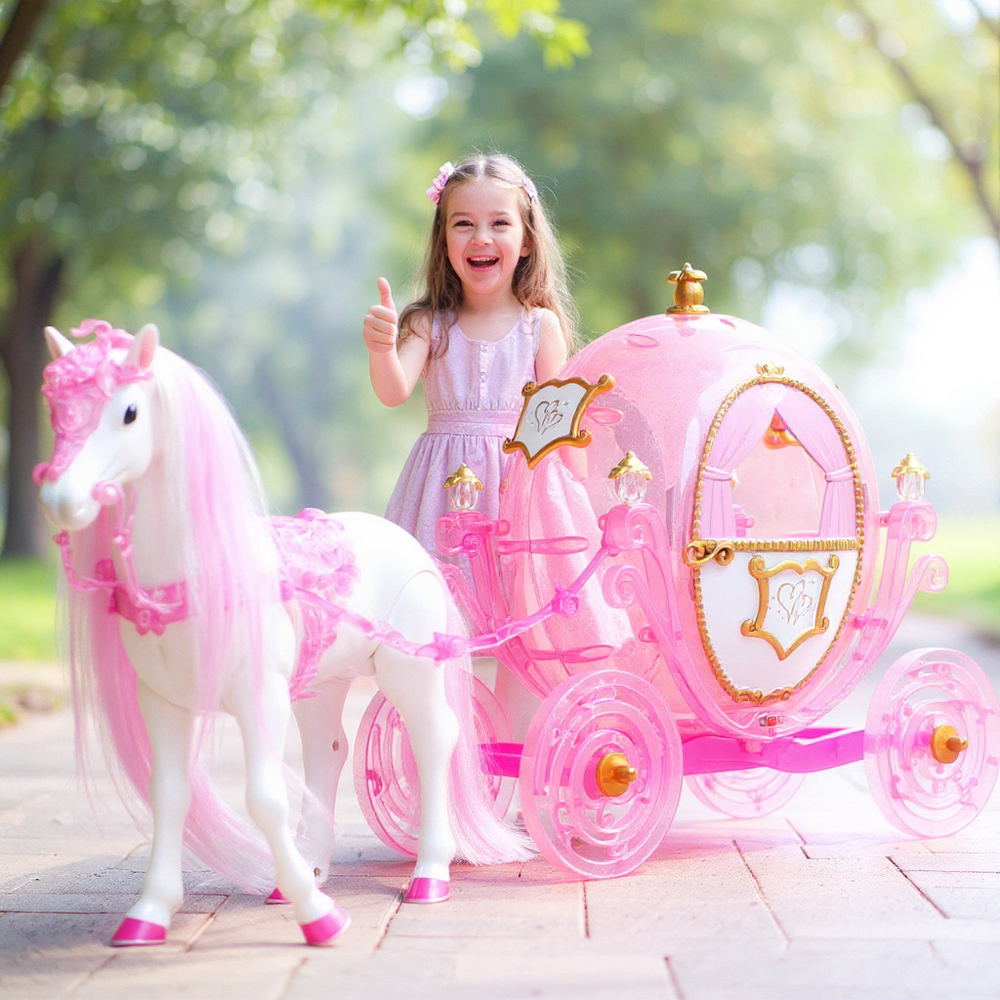 - Wyjątkowa zabawka: duża karoca w kształcie dyni z chodzącym konikiem i efektami dźwiękowymi dla dziewczynek 3+, rozwija wyobraźnię, jako prezent idealny.