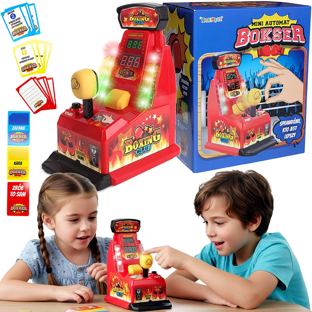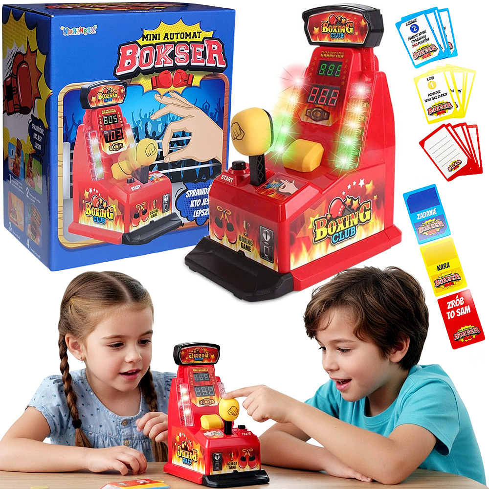 • Mini maszyna bokserska dla dzieci – gra zręcznościowa „Bokser Mini – mierzenie siły” z efektami świetlnymi i dźwiękowymi, karty z zadaniami, idealna do zabawy rodzinnej i rozwoju refleksu.
