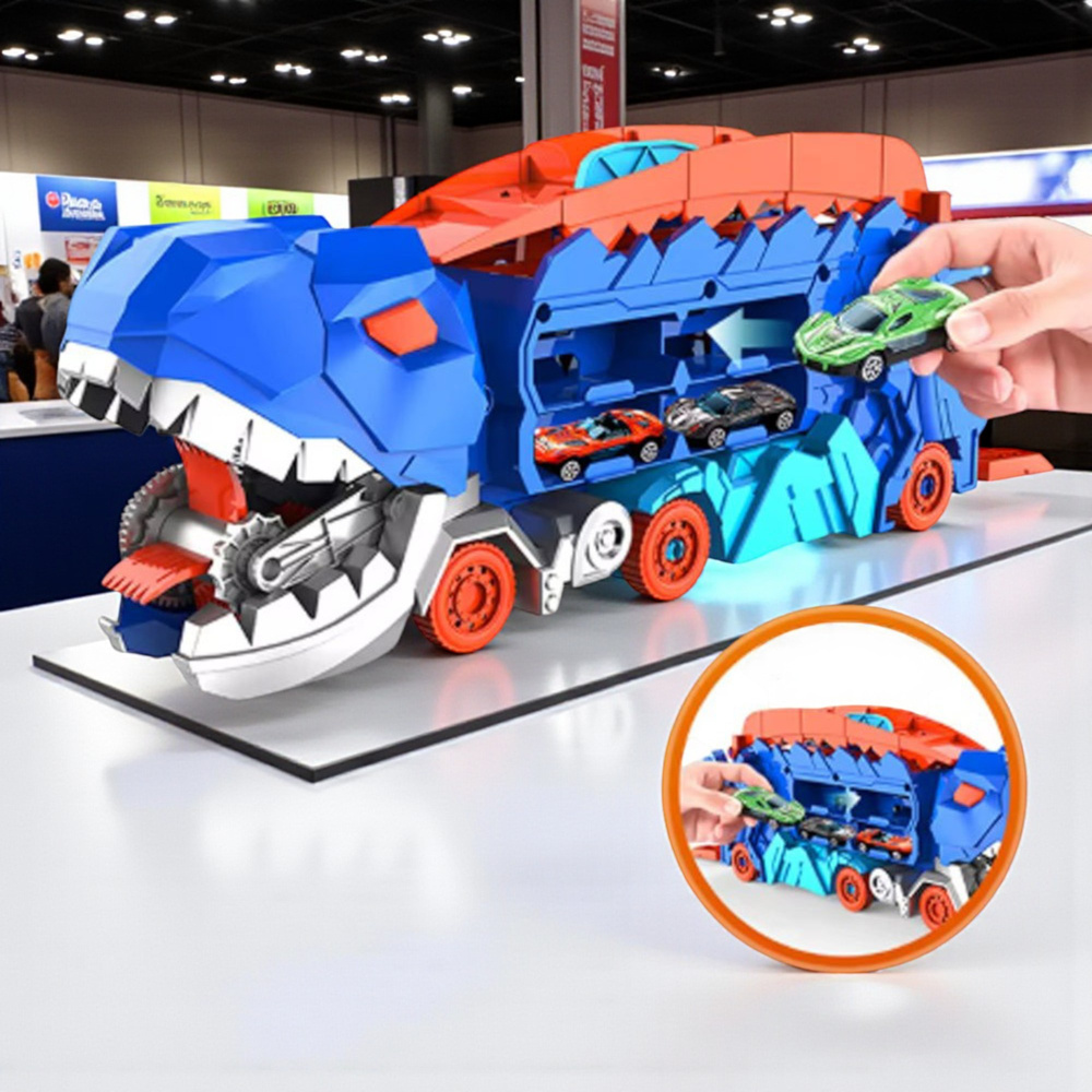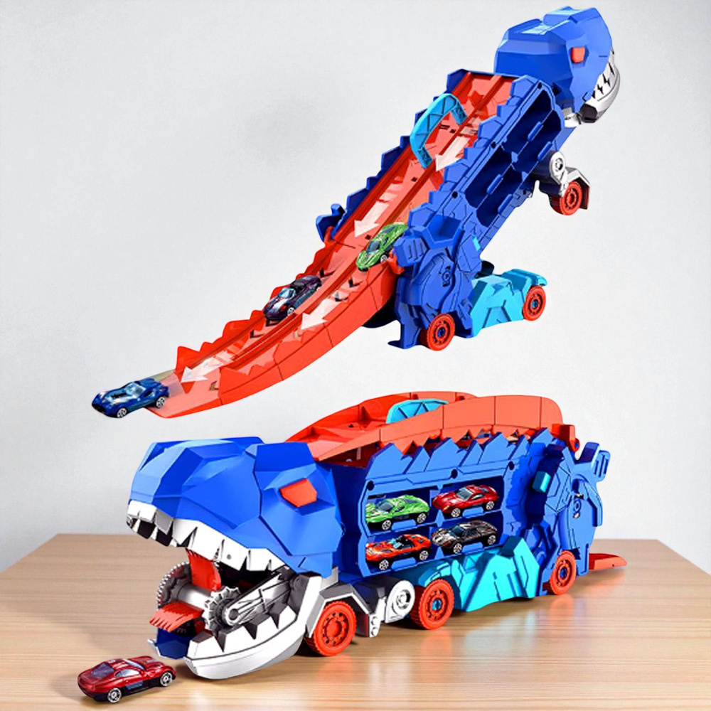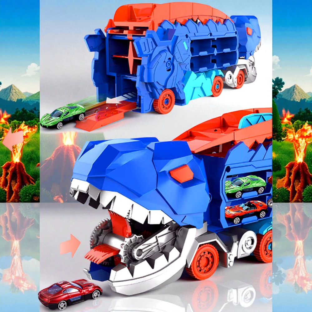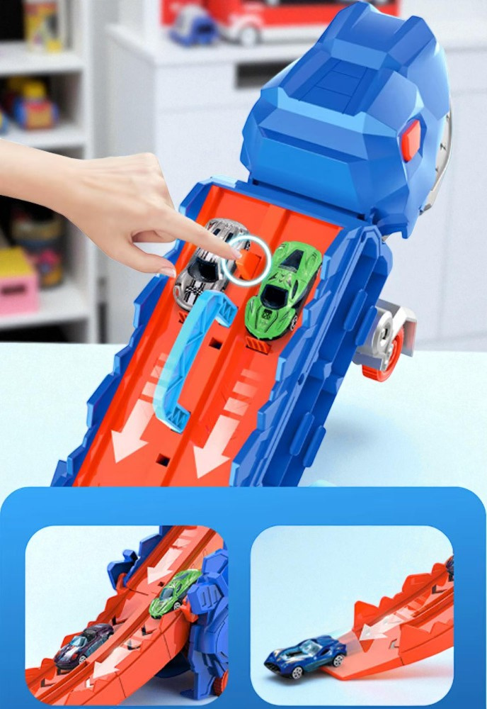 DINOZAUR ZABAWKOWY SAMOCHÓD 3W1 – TOR WYŚCIGOWY + TRANSPORTER + DINOZAUR