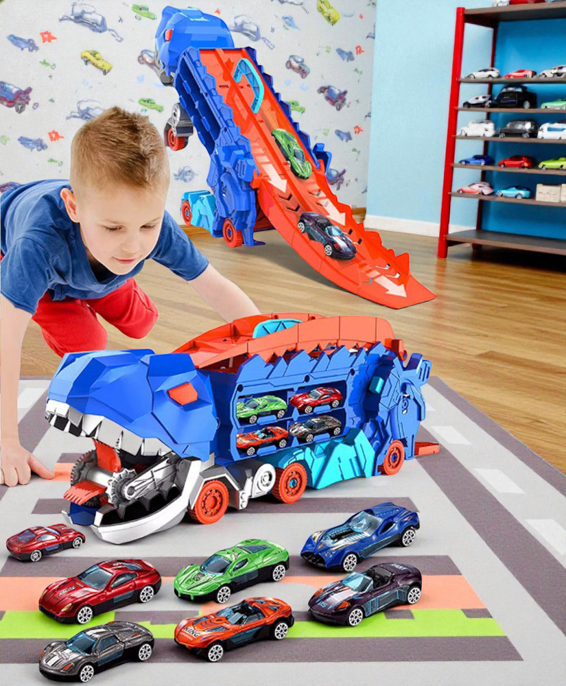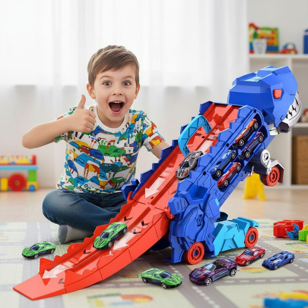 - Zestaw Dinozaur + Tor Wyścigowy + Transporter Samochodzików – idealny prezent dla chłopców 3-6 lat!