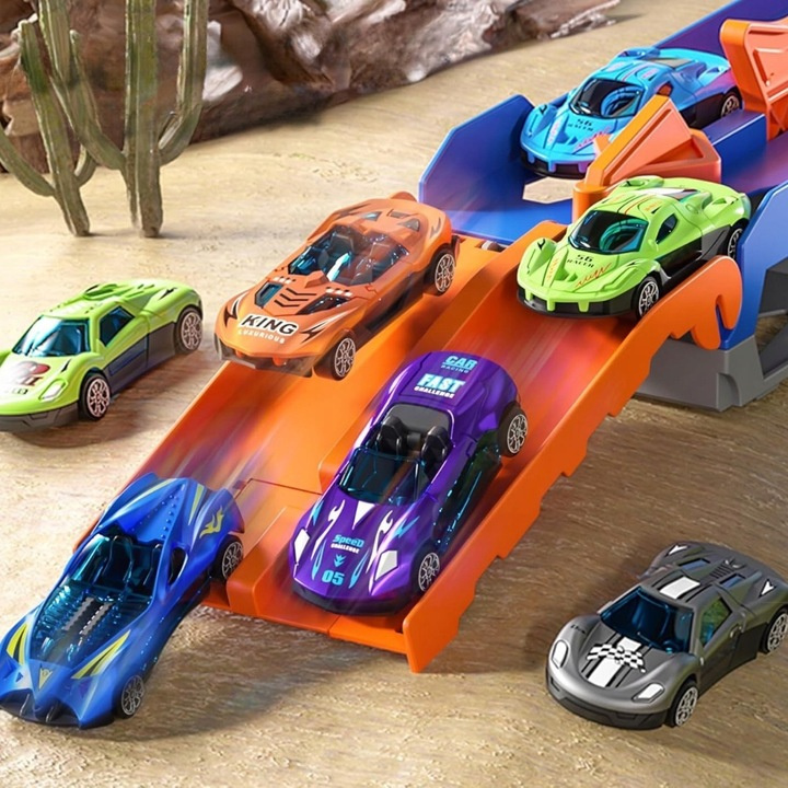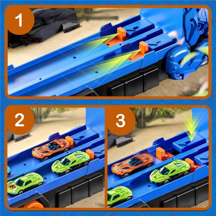 - Tor wyścigowy / zjeżdżalnia – otwórz ciężarówkę i stwórz rampę, po której autka mkną w dół z zawrotną prędkością!