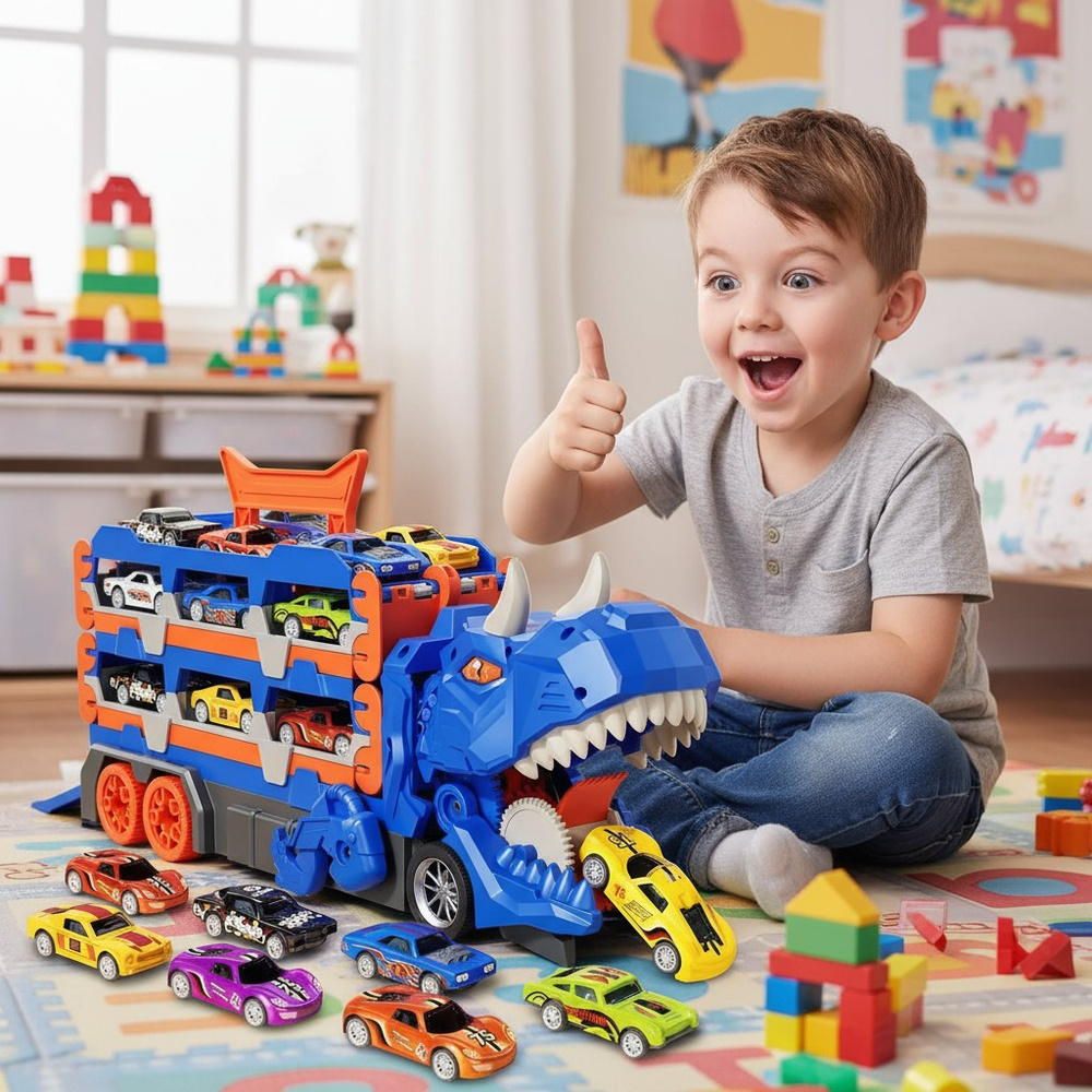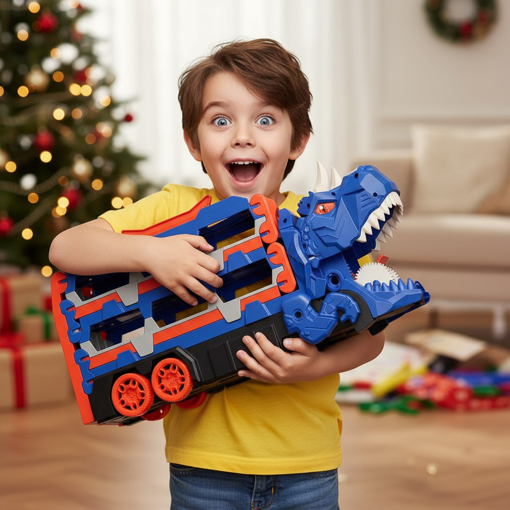 Poznaj niezwykły zestaw 3 w 1, który połączy w sobie wszystko, co dzieci kochają najbardziej — dinozaury, samochodziki i wyścigi! Gigantyczny Tyranozaur-Transporter to wyjątkowa zabawka, która rozwija wyobraźnię, uczy koordynacji i zapewnia godziny wciągającej zabawy.