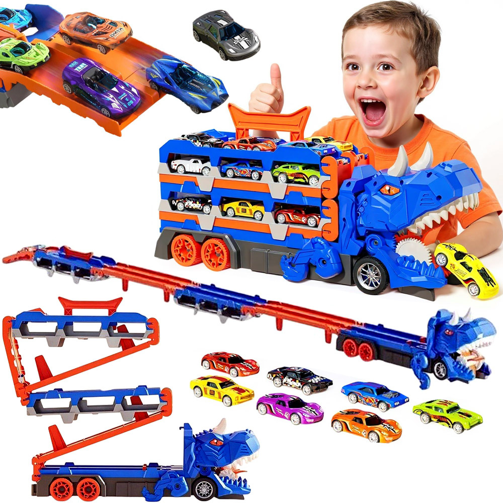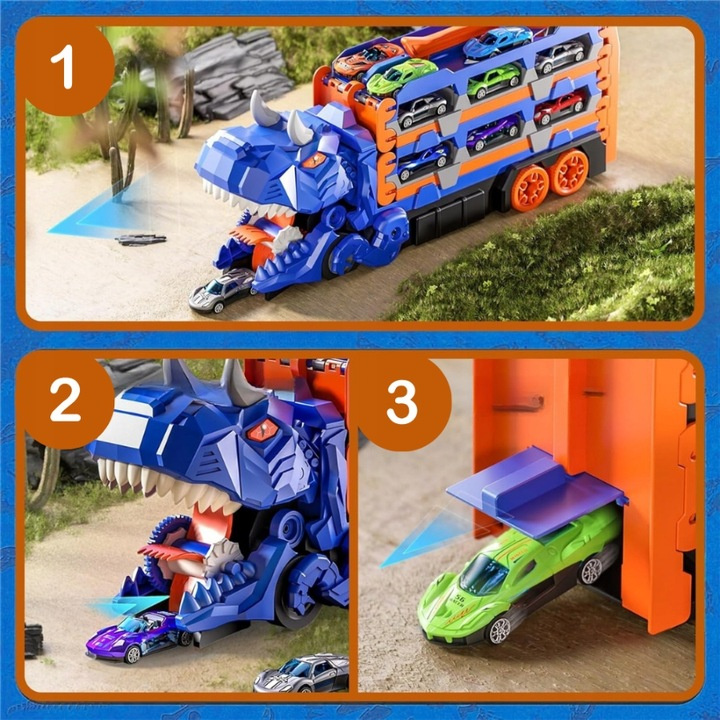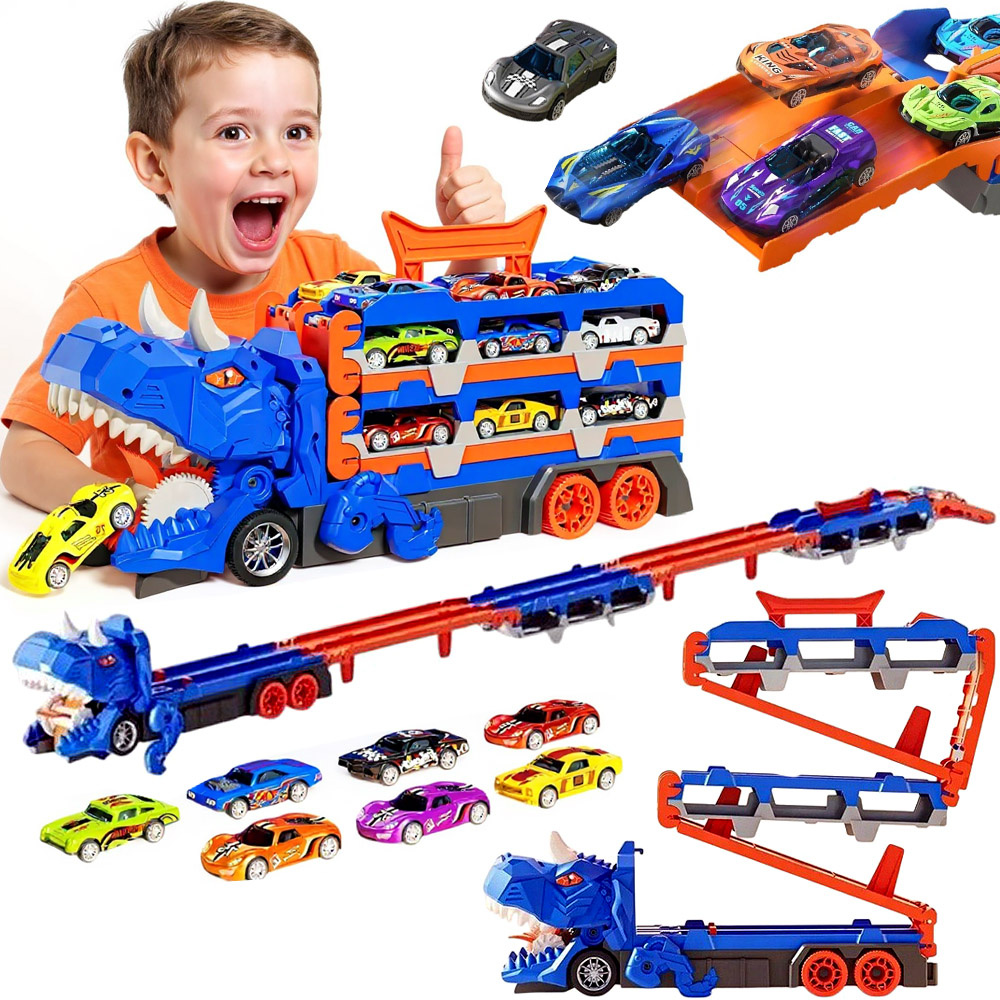 - Wyjątkowy zestaw 3w1: gigantyczny tyranozaur-samochód bimorf, tor wyścigowy, ciężarówka-transporter; dla chłopców 3-6 lat. Wysoka jakość ABS, kreatywna zabawa, idealny prezent.