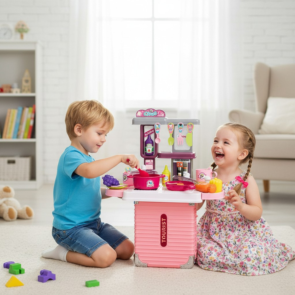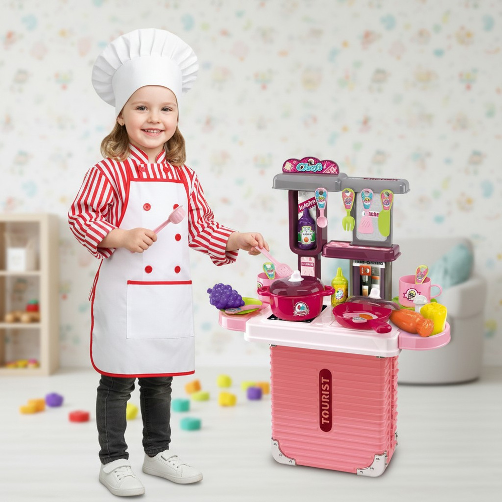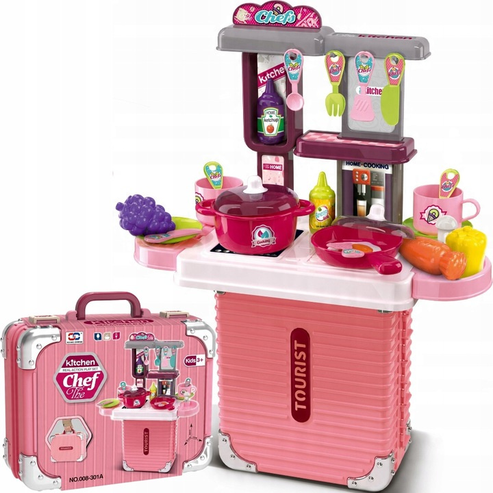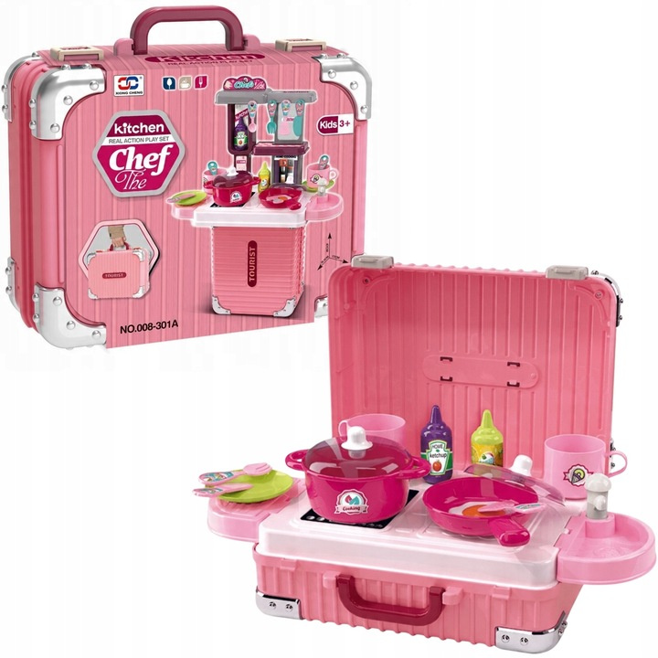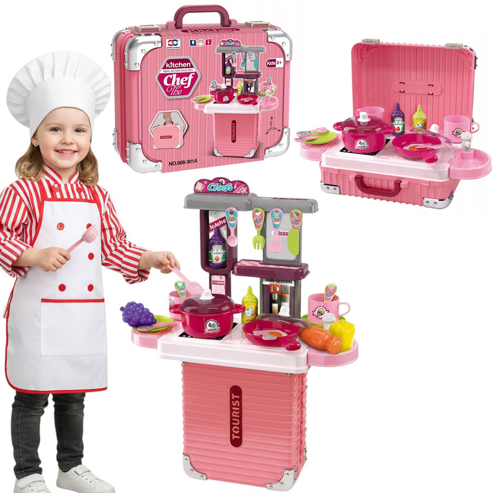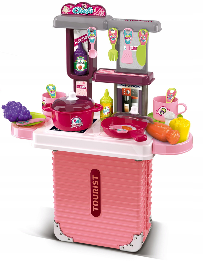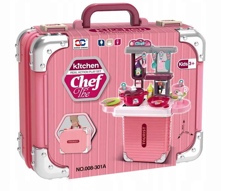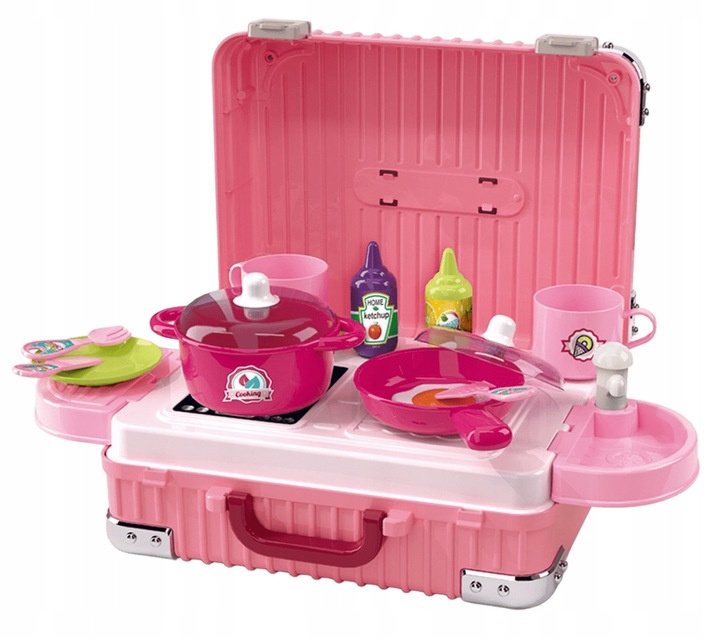 Kuchnia dla dzieci w formie walizki to połączenie praktyczności z wielką frajdą. Zestaw dostarcza dziecku emocjonującej zabawy, a jednocześnie wpływa pozytywnie na jego rozwój. Dzięki temu, że wszystkie elementy mieszczą się w walizce — nie zajmuje dużo miejsca w domu i jest idealna do transportu.
