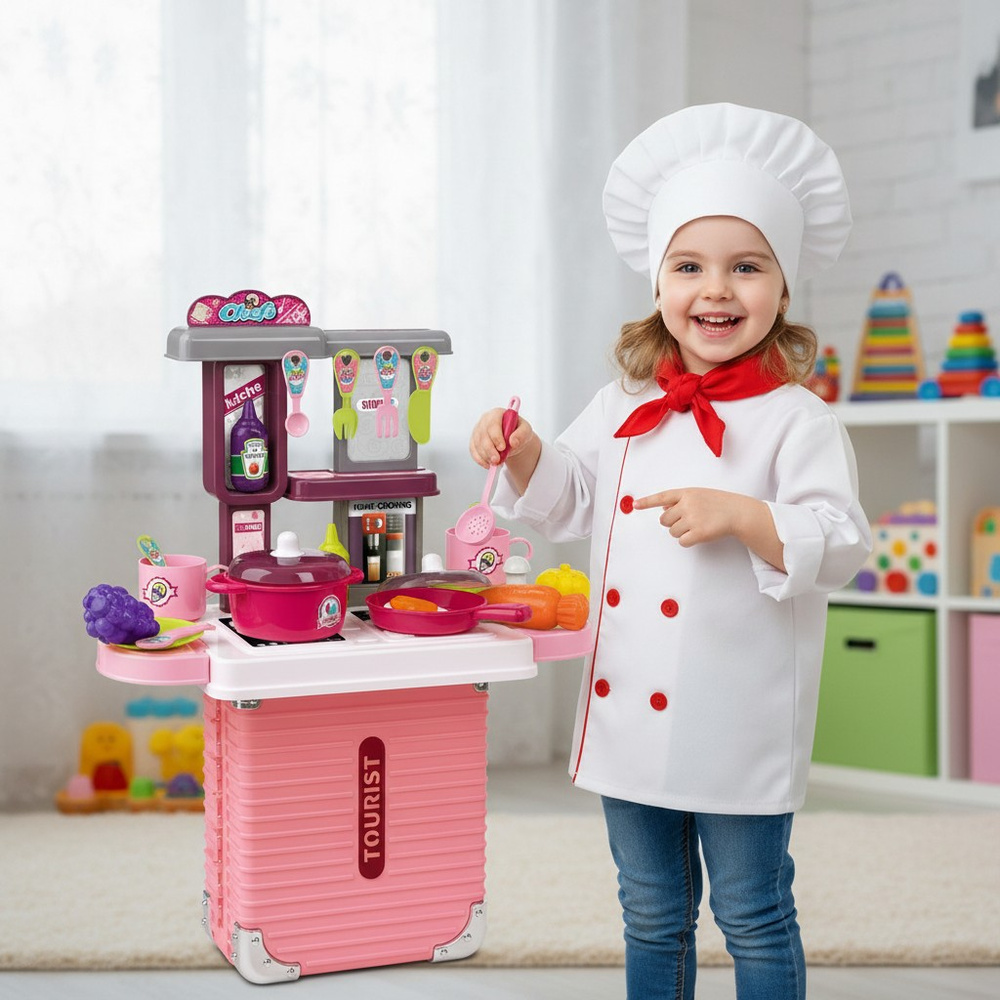 Zestaw kuchenny w formie różowej walizki to idealna zabawka dla dzieci, które uwielbiają naśladować dorosłych i odgrywać codzienne czynności. Ta kuchnia dla dzieci została zaprojektowana z myślą o najmłodszych szefach kuchni, łącząc funkcjonalność, atrakcyjny wygląd oraz mobilność.
