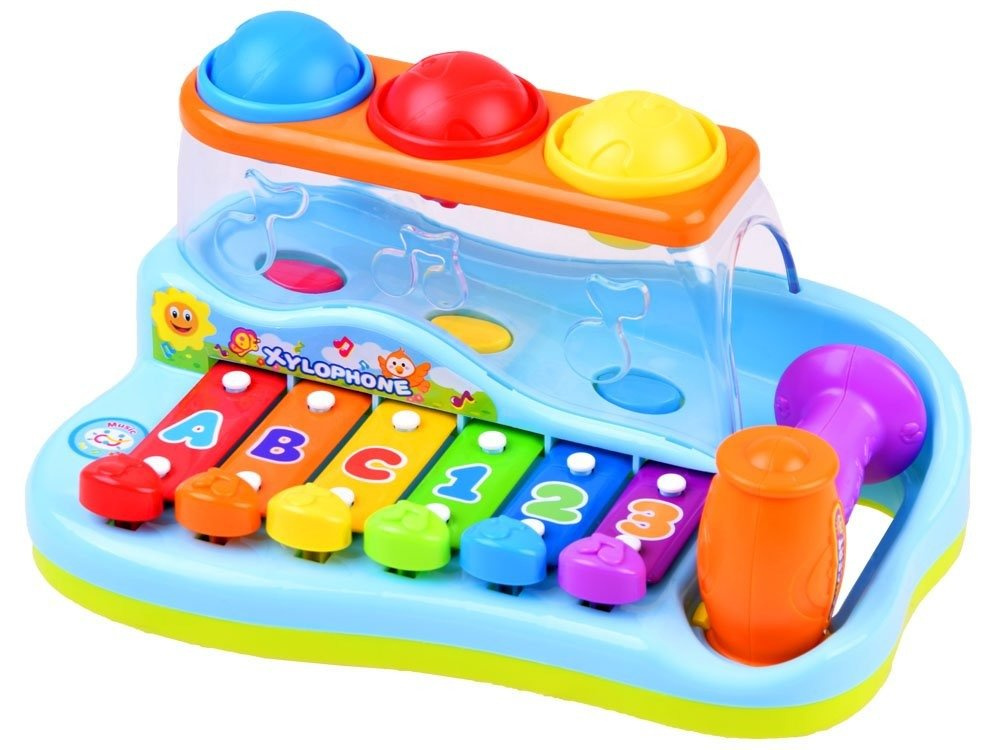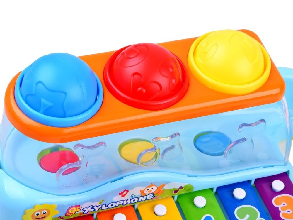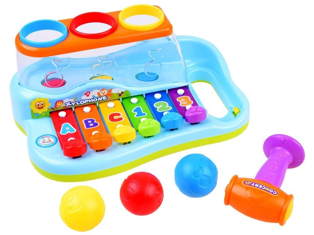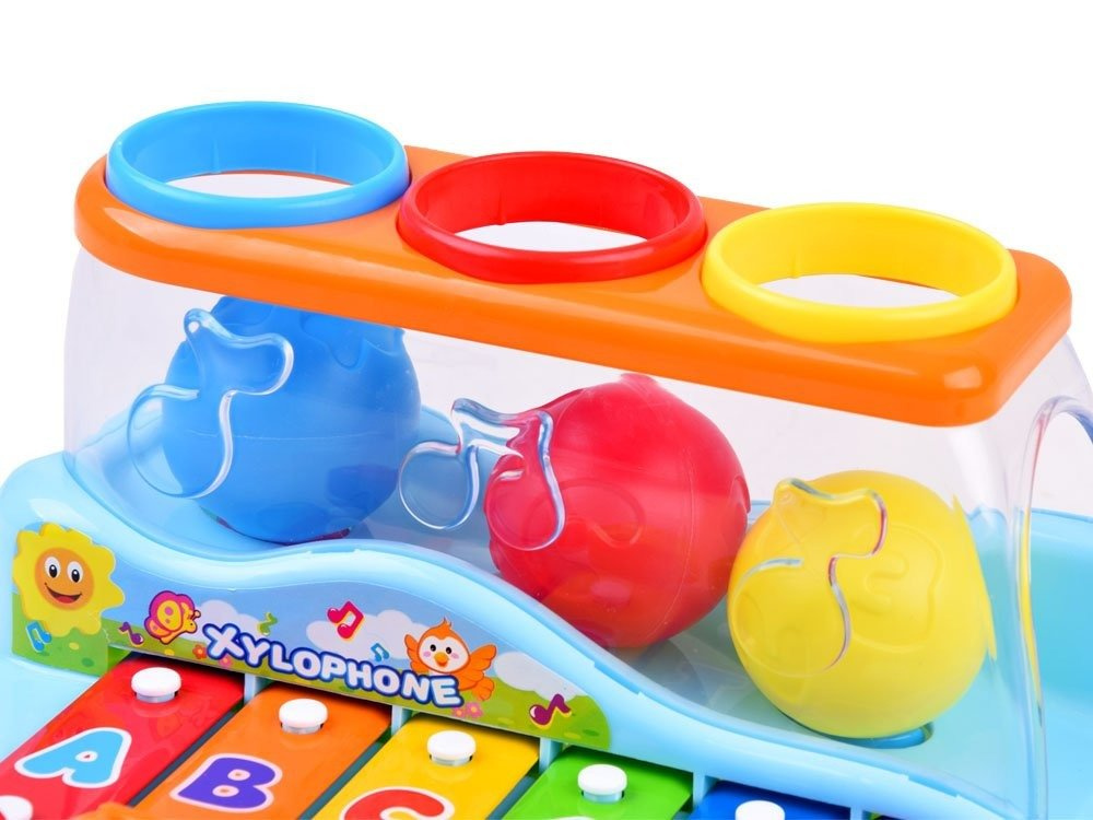 Dziecko, podczas zabawy, może uderzać młoteczkiem w klawisze lub wbijać piłeczki poprzez otwory - wówczas wydobywa się dźwięk z cymbałek. Piłeczki podczas uderzania wybijają dodatkowe nutki. Na klawiszach są namalowane cyferki i literki - co pozwala dodatkowo dziecku zapamiętywać kolejność uderzania.