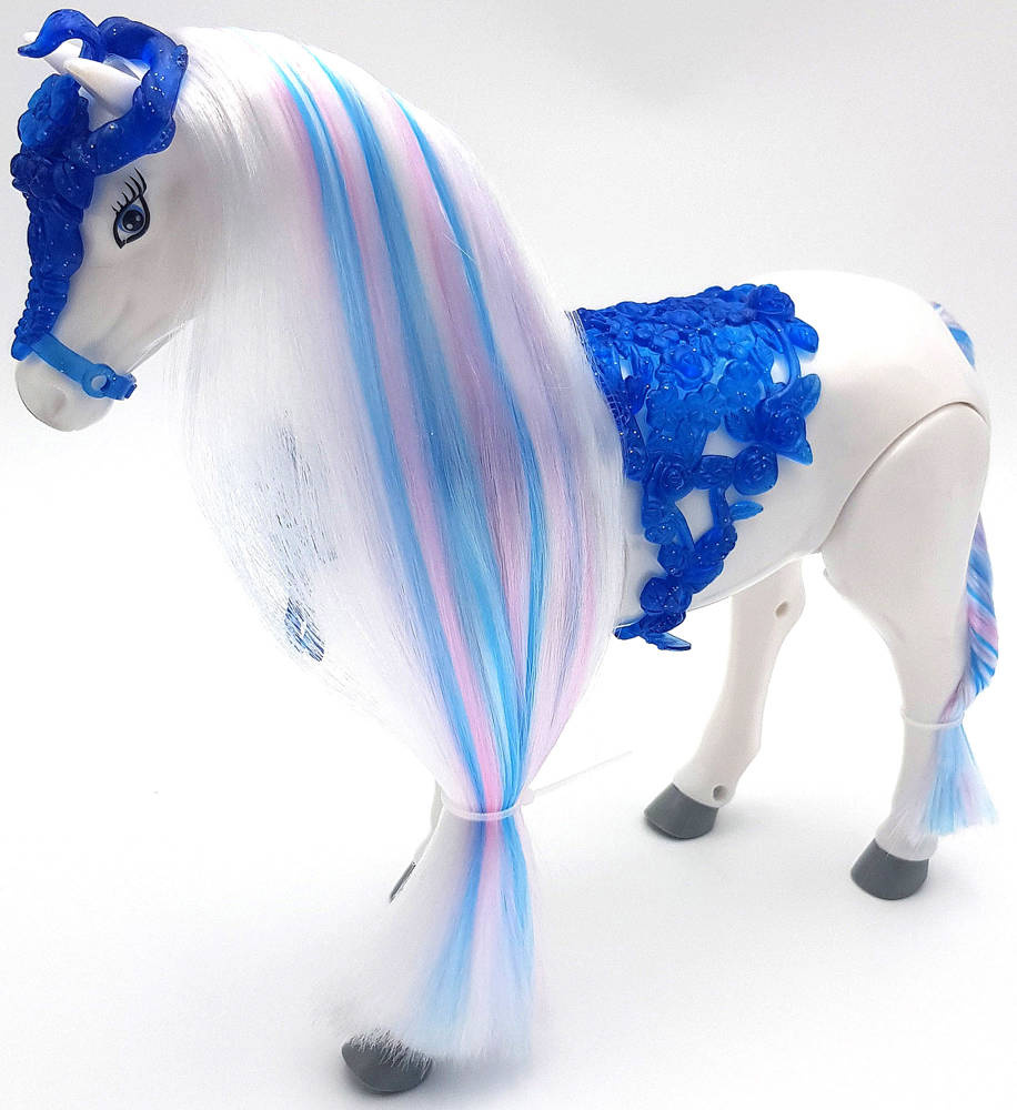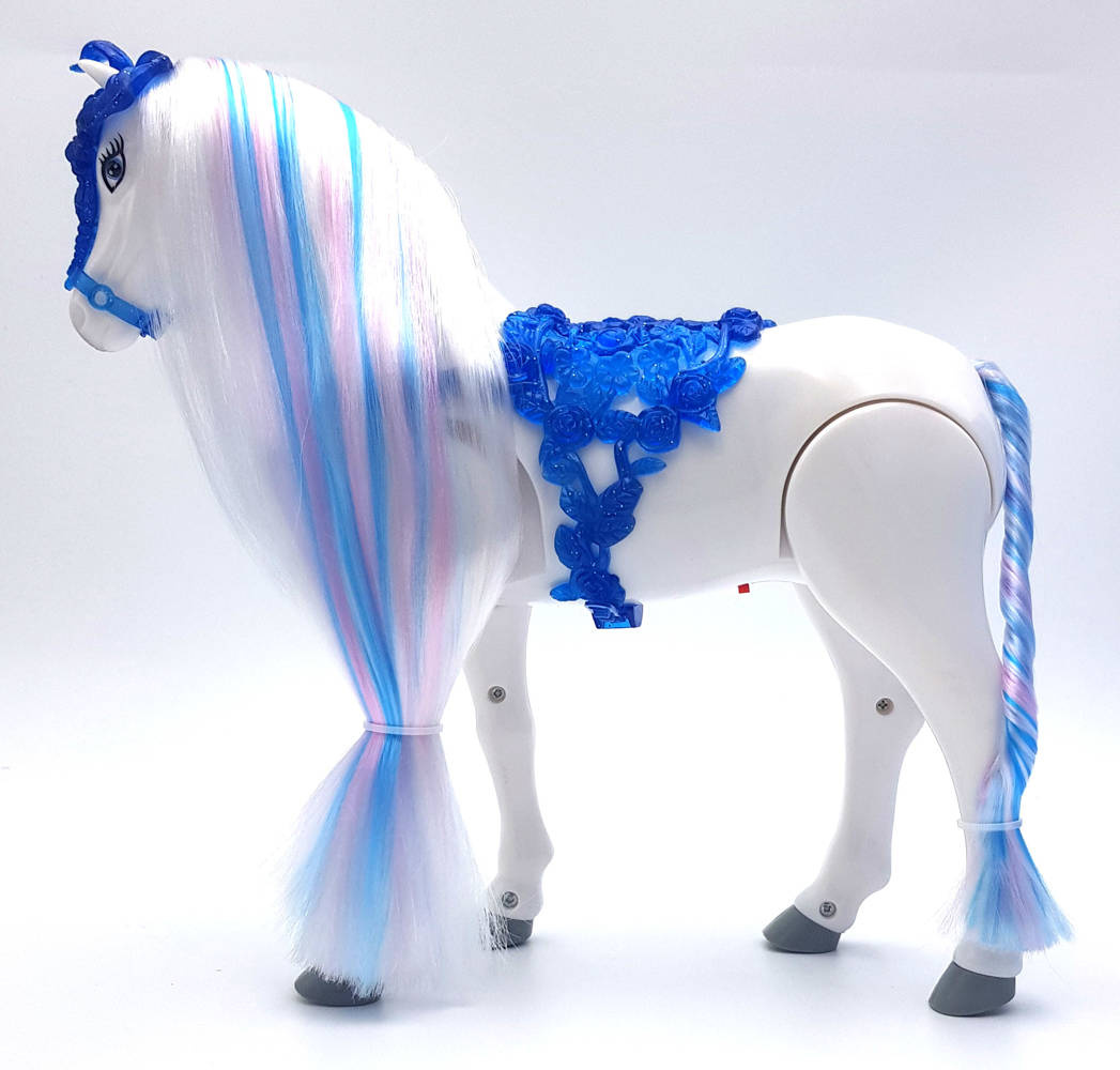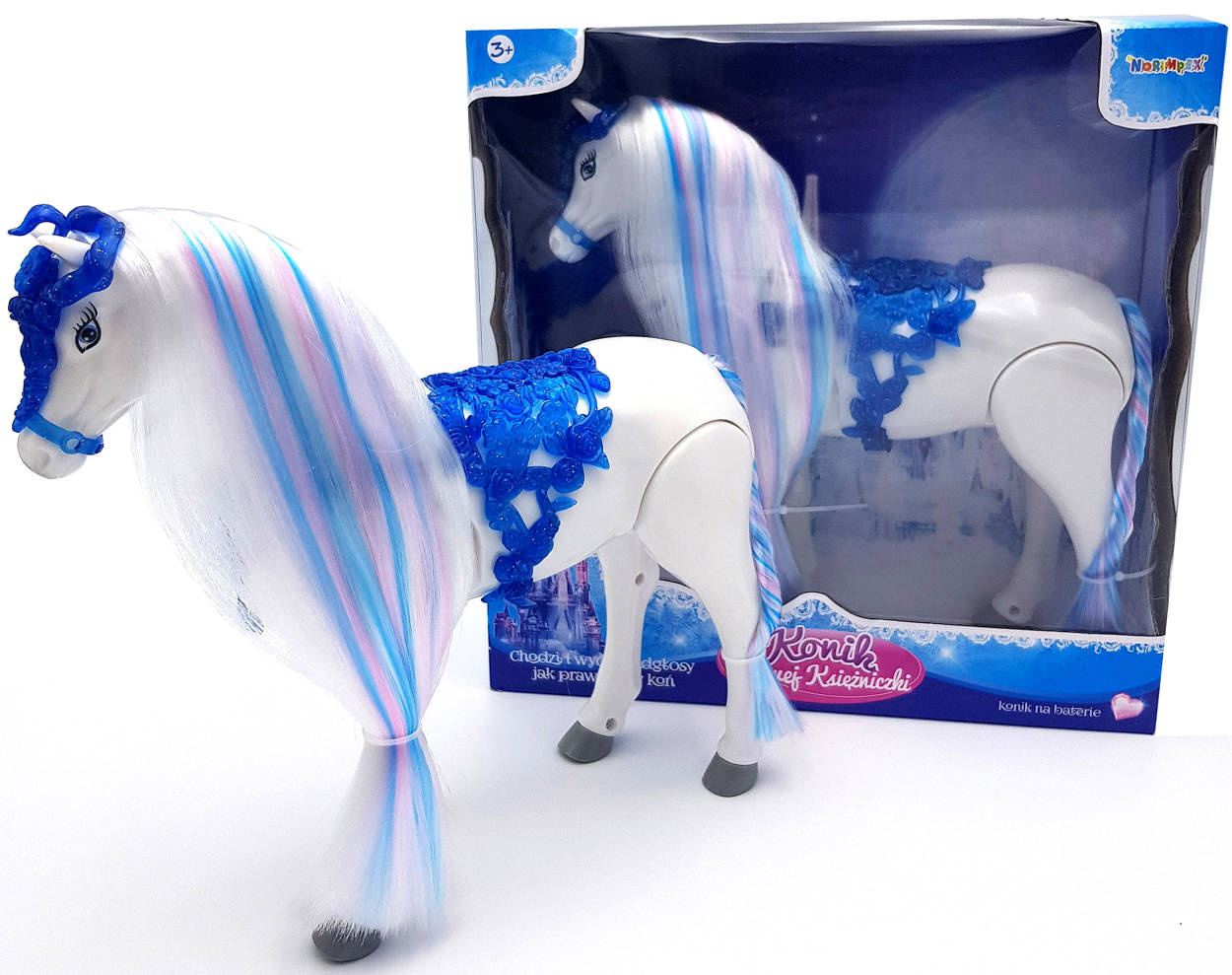 Wspaniały interaktywny chodzący koń z długą grzywą dla lalek. Będzie rewelacyjnym prezentem, który zachwyci każde dziecko. W zestawie znajduje się koń o długiej, lśniącej biało-niebiesko-różowej grzywie.
