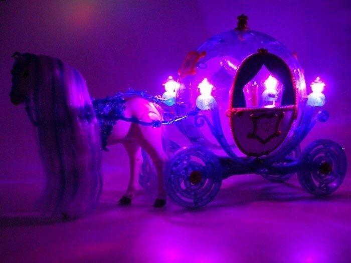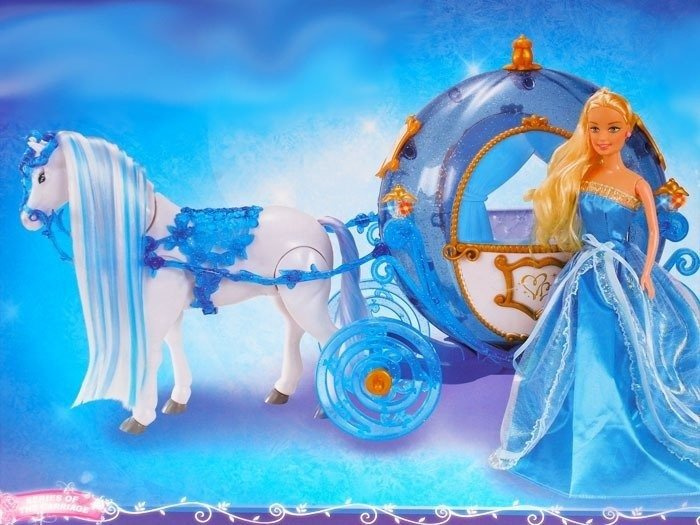 Dla utrwalenia tej pięknej bajki proponujemy ten cudowny zestaw karoca z chodzącym konikiem, który wydaje odgłosy rżenia.