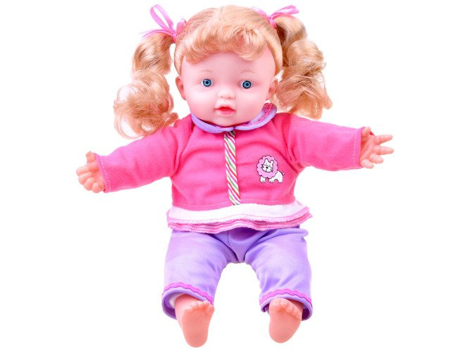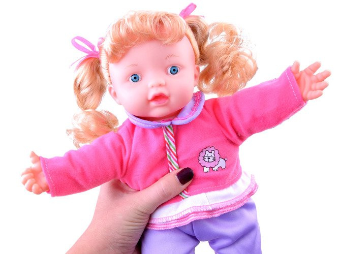 Interaktywna lalka w kołysce z akcesoriami do pielęgnacji i karmienia zapewni mnóstwo czułości i radości każdej małej opiekunce. Interaktywna lalka jest mięciutka wypełniona miękkim materiałem, tułów lalki wykonany jest z materiału, gumowe jest głowa, dłonie i stopy lalki. Lalka posiada długie blond włosy zawiązane w urocze kucyki. Ubrana jest w różową bluzeczkę i fioletowe spodenki.
