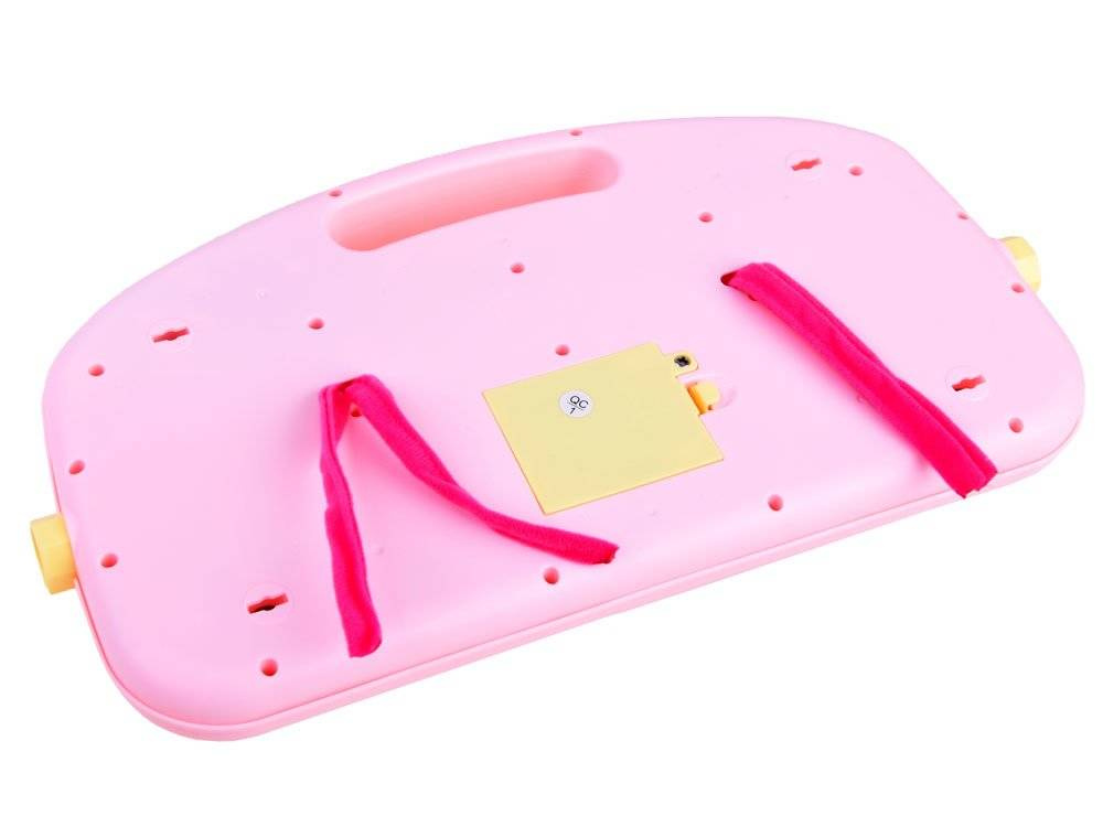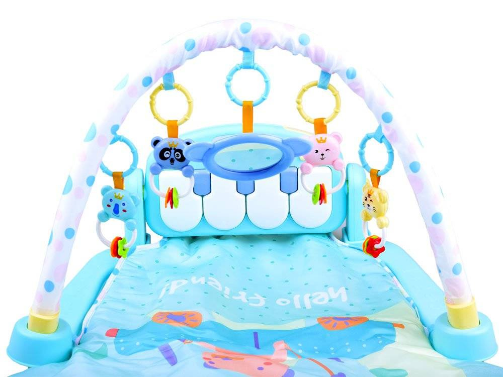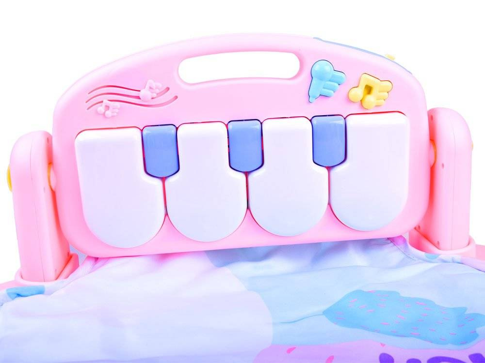 • mata wyposażona jest w plastikowe łącznki, dzięki którym można zamontować pałąk oraz pianinko, wówczas dziecko może samodzielnie naciskać stopami lub rączkami klawisze i bawić się wiszącymi nad głową grzechotkami