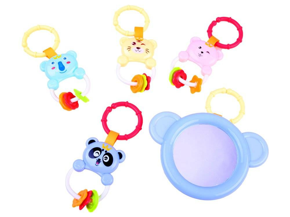 • 4 kolorowe grzechotki zawieszone są na plastikowych kółeczkach, które można w dowolnym momencie przewieszać z miejsca na miejsce