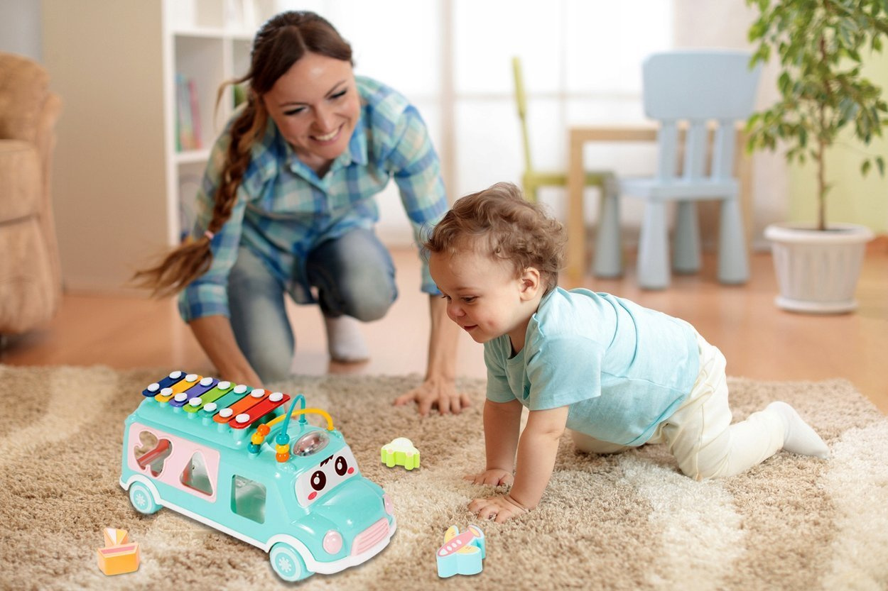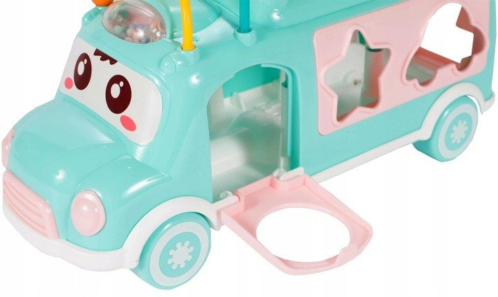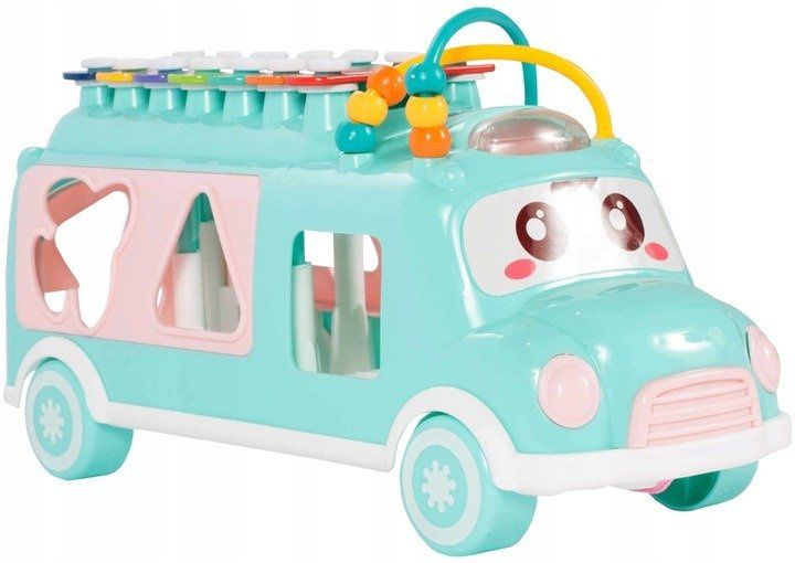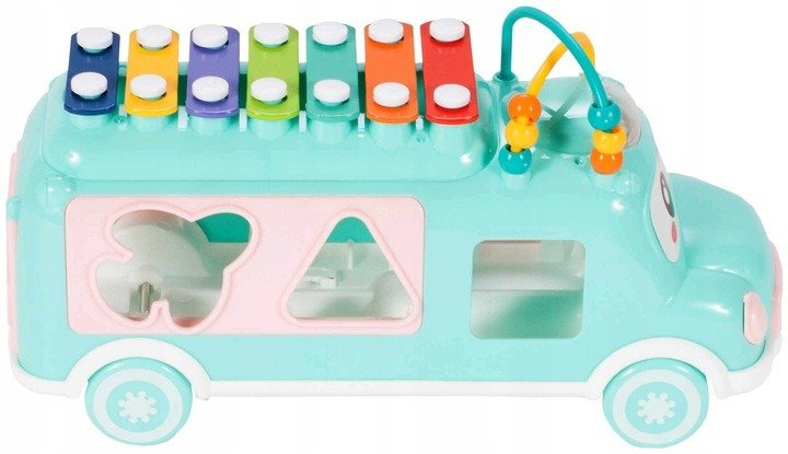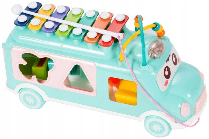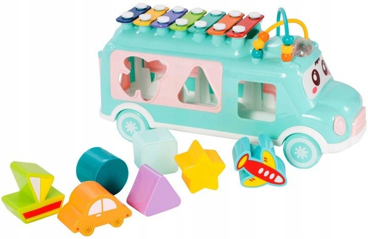 Kolorowy autobus zawiera w sobie aż trzy zabawki w jednej. Może służyć jako instrument jakim są cymbałki, sorter z klockami w różnych kształtach oraz zwykły pojazd.
