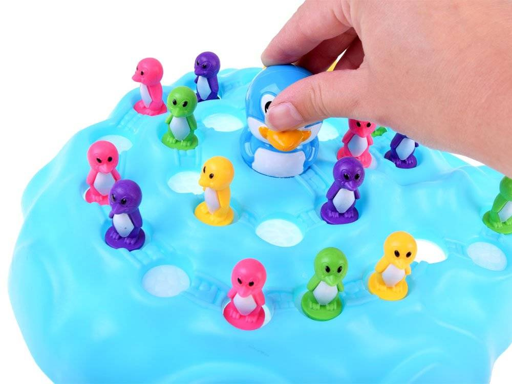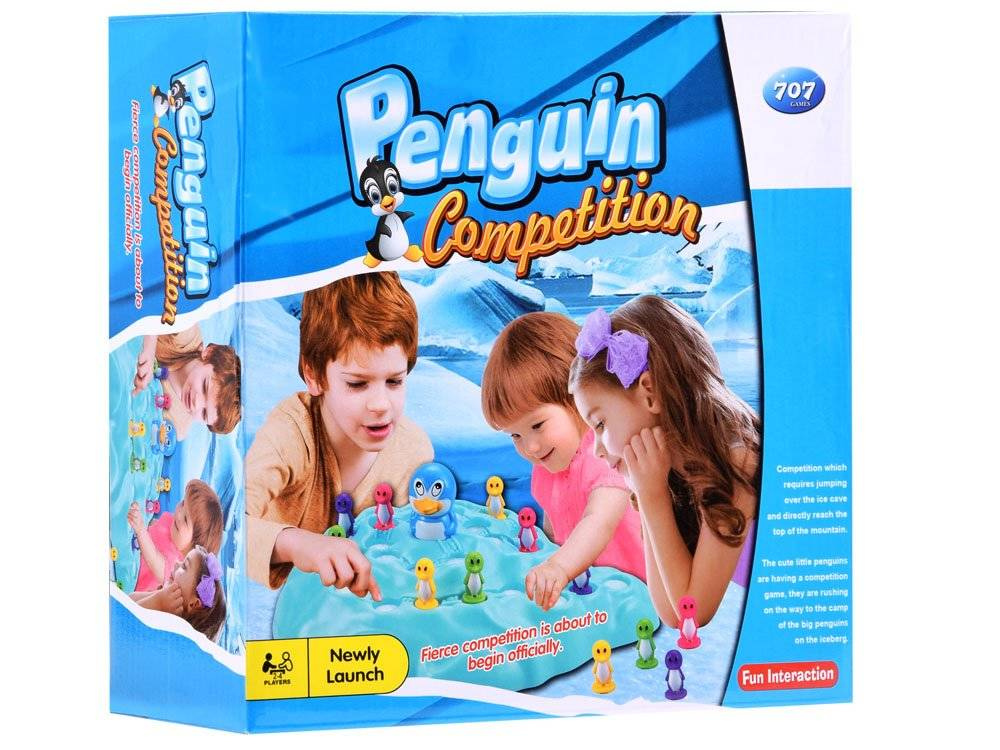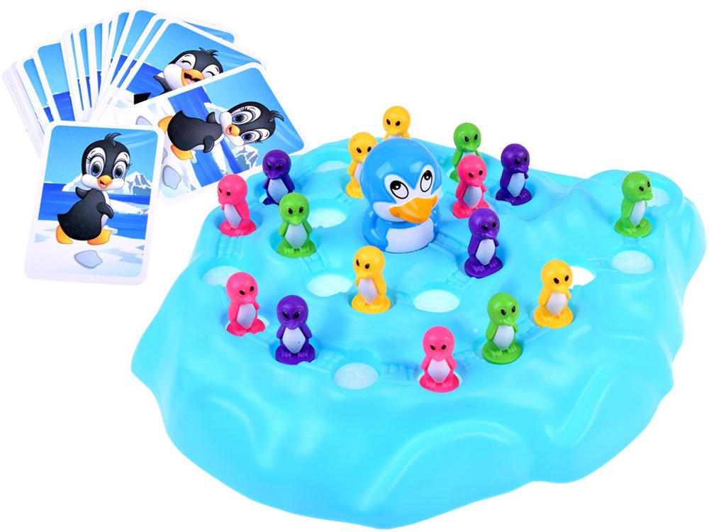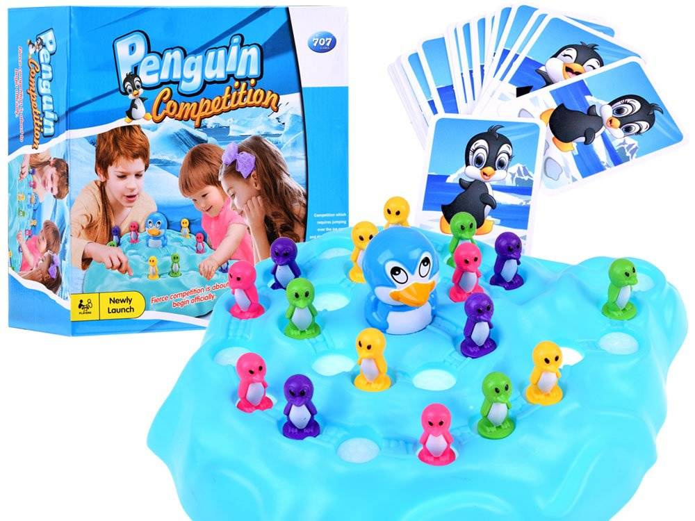 Celem gry jest zdobycie wzgórza z dużym pingwinem. Tylko to nie jest takie łatwe jak się wydaję, ponieważ po drodze czają się niespodziewane dołki, które powodują że małe pingwinki zapadają się pod górę lodową i wówczas trzeba zacząć wyścig od początku! Karty należy ułożyć na stole, po wylosowaniu karty postąpić zgodnie ze wskazówkami (jeśli wylosowałeś pingwinka z jednym krokiem , przesuwasz się o jedno pole, jeśli z dwoma to o dwa pola, a jeśli z trzema to o trzy pola). A jeśli wylosujesz kartę z obrotowym pingwinem to wówczas może stać się wszystko! Ten kto był ostatni może być pierwszy! Zabawa nieprzewidywalna, emocje murowane!