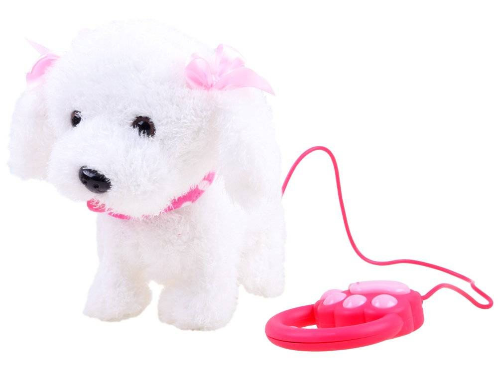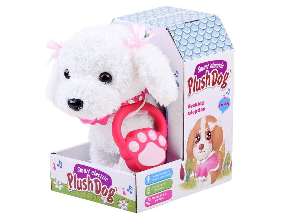 • smycz posiada przycisk, który uruchamia chód pieska, merdanie ogonkiem i odgłosy dźwiękowe, szczekanie