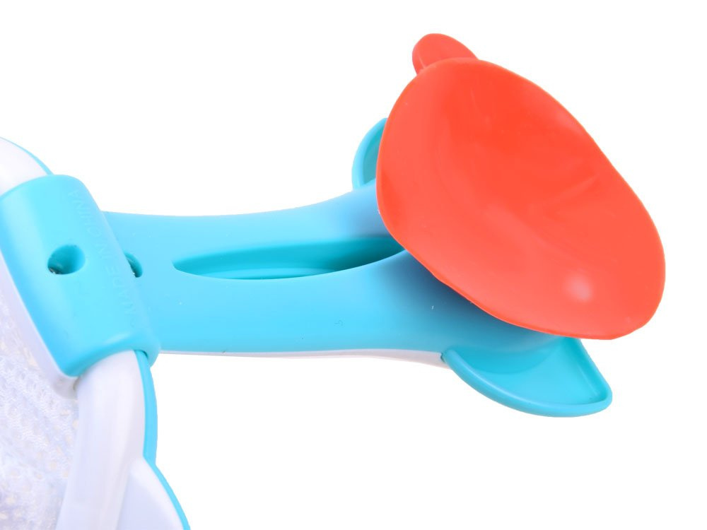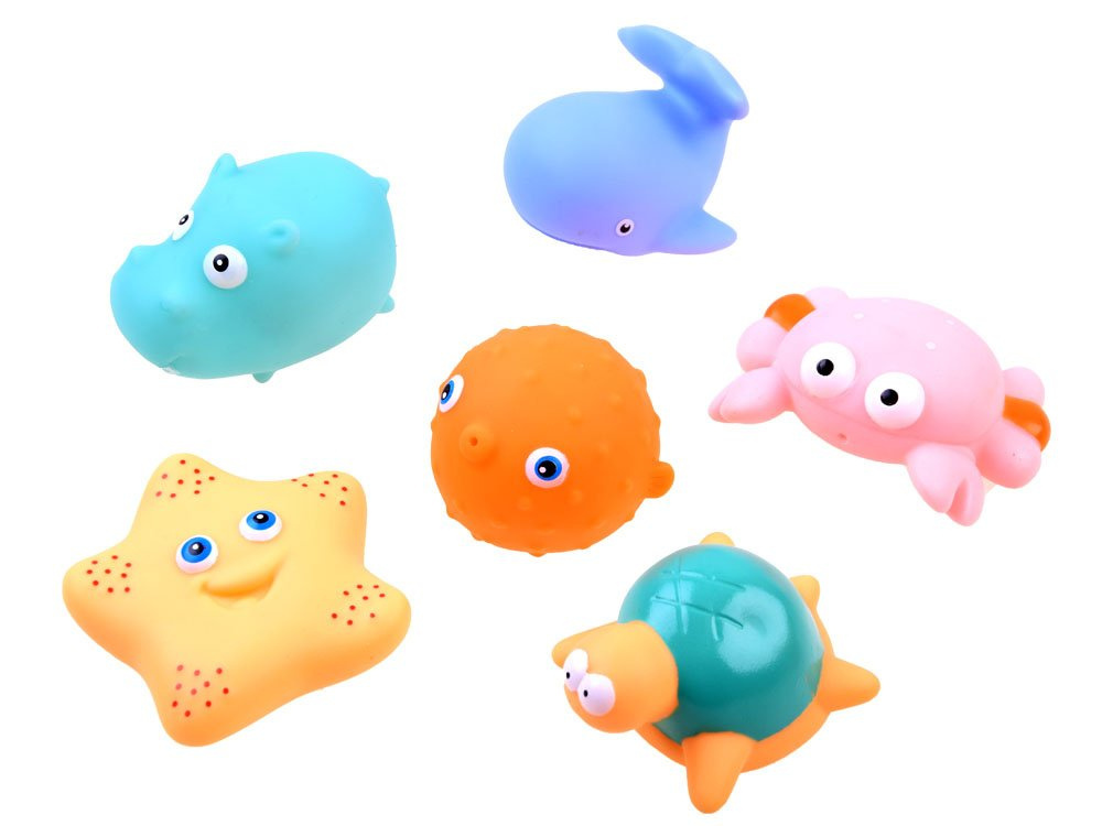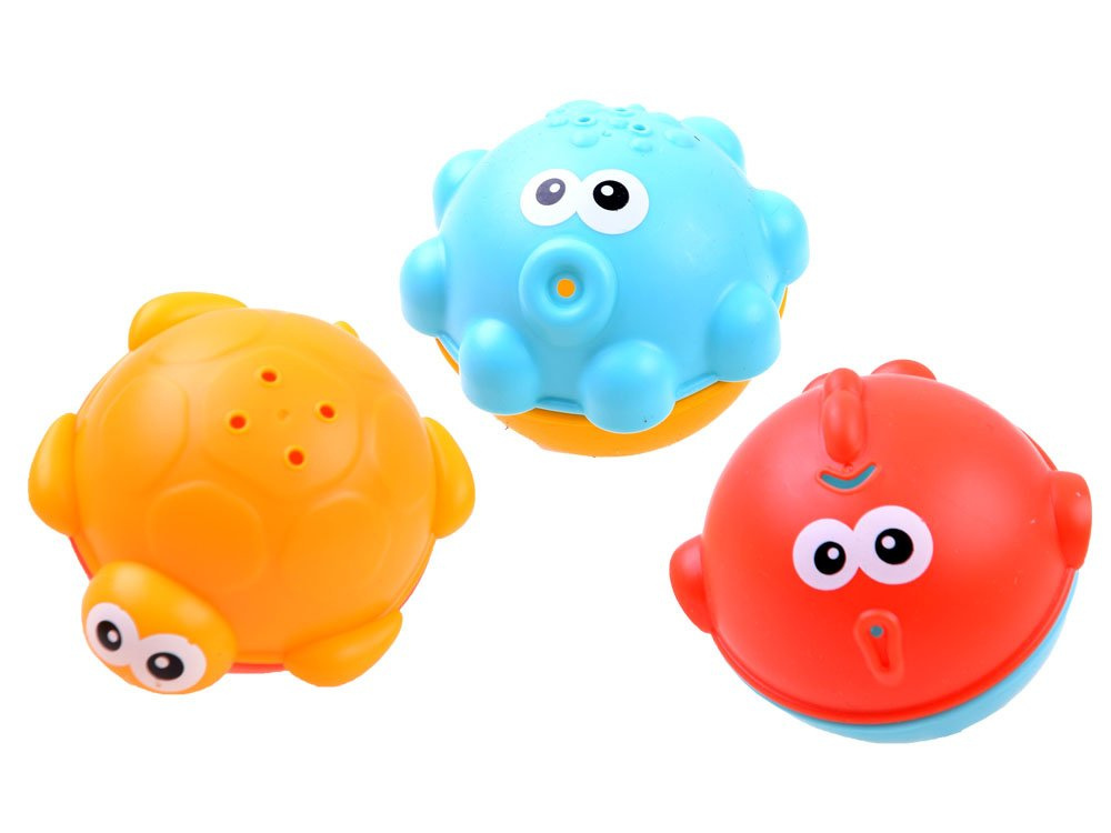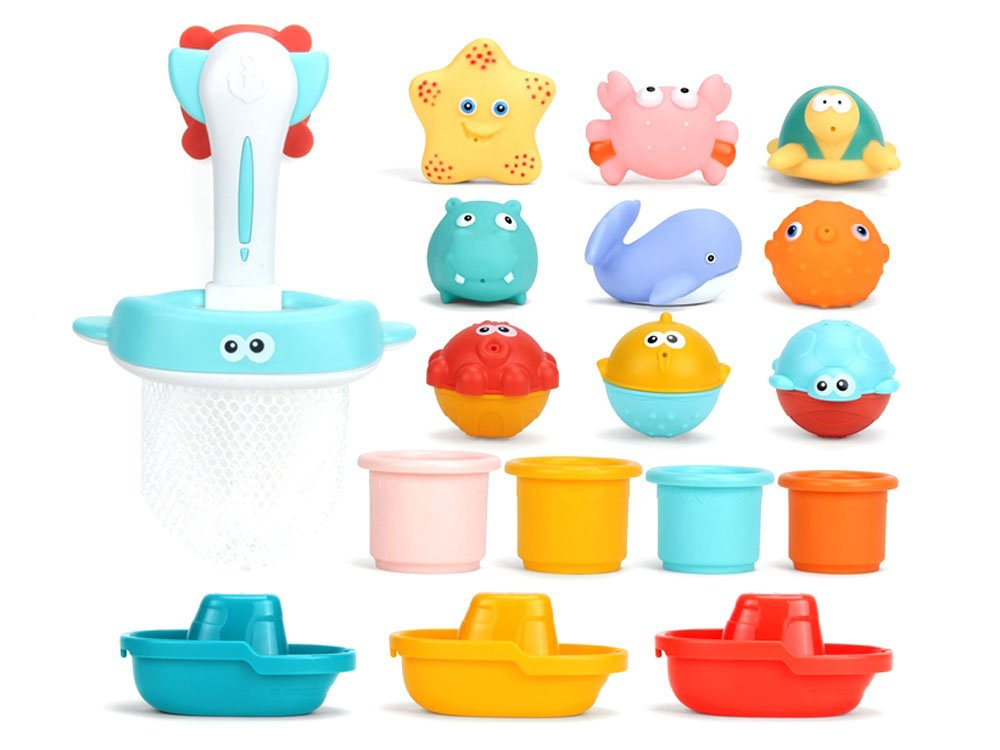 Gumowe zwierzątka posiadają otwory, dzięki którym można robić mini fontannę. Dziurki w kubeczkach posłużą do przelewania wody, a w rozkładanych kulach można schować jakiś mały skarb. Podbierak posiada przyssawkę, dzięki której może być organizerem na zabawki. Siatka w podbieraku ma wszyty ściągacz, a rączka jest regulowana- podczas kąpieli można zagrać w wodną koszykówkę. Komu uda się dzisiaj trafić zabawką do celu?