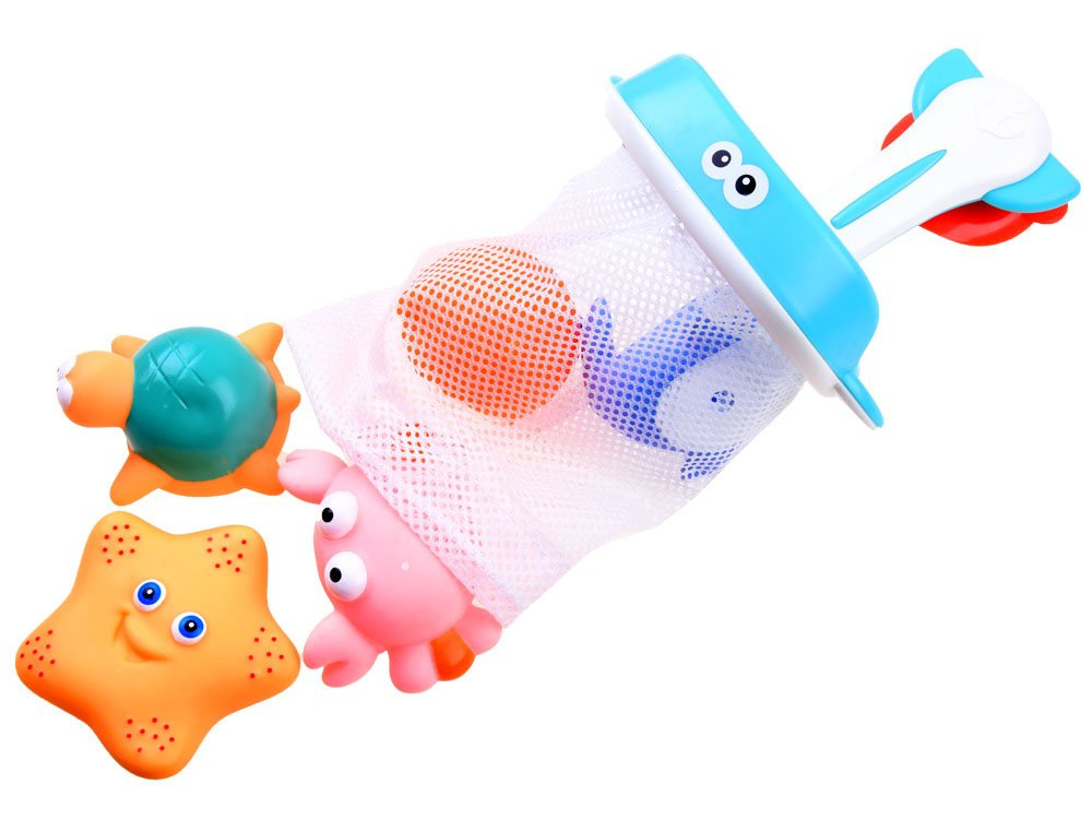 - zestaw zabawek do wanny do kąpieli gumowe zwierzątka statki siatka organizer