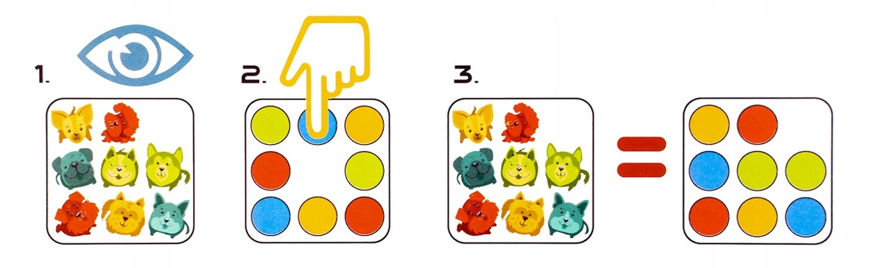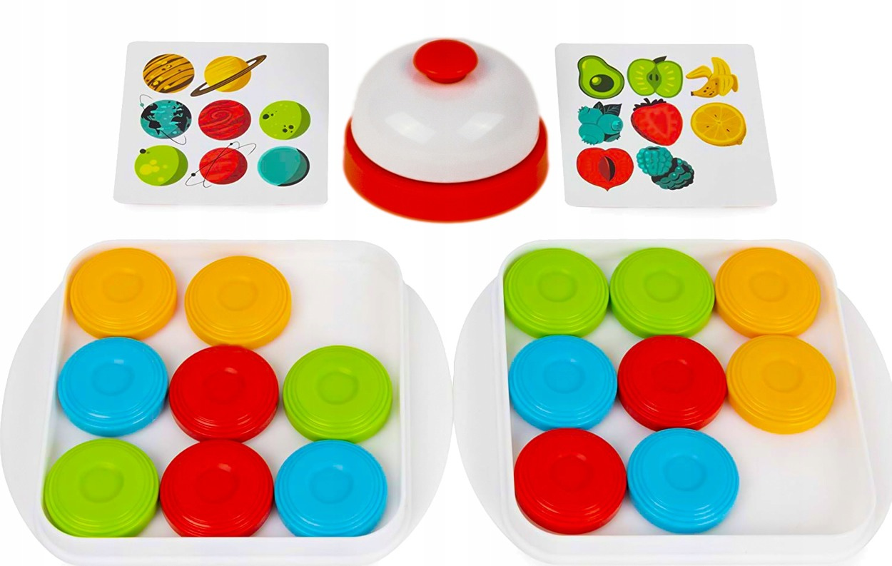 Krążki są ułożone dla obu graczy tak samo. Należy je jak najszybciej dopasować do podanego wzoru kolorystycznego z wylosowanej karty.