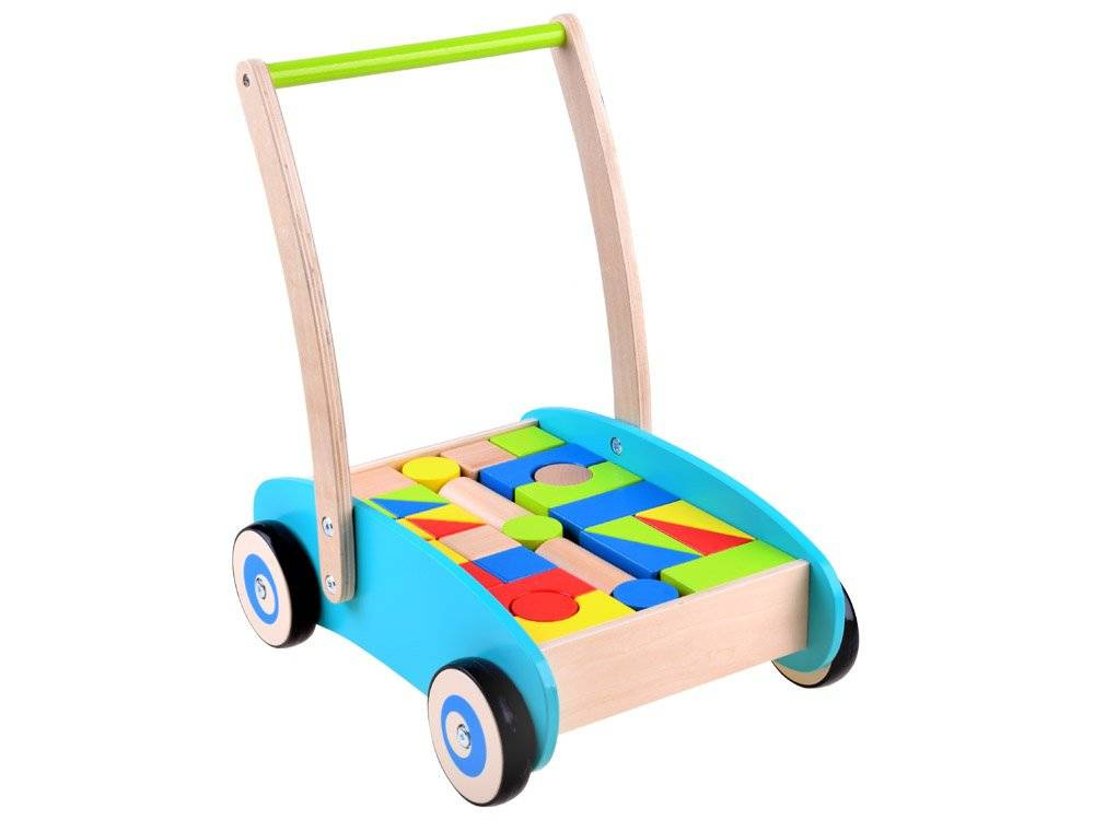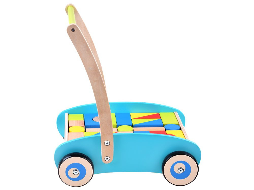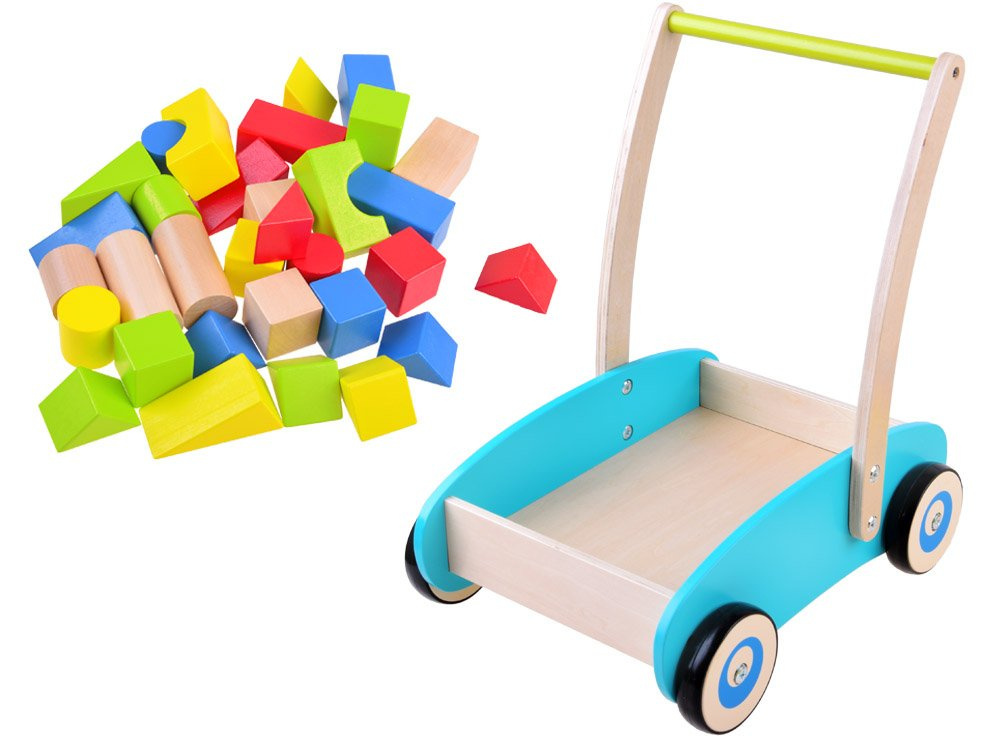 Drewniany chodzik, pchaczyk, wózeczek z kolorowymi drewnianymi dużymi klockami na pewno zapewni dużo zabawy najmłodszym pociechom, które lubią przenosić swoje rzeczy z miejsca na miejsce.