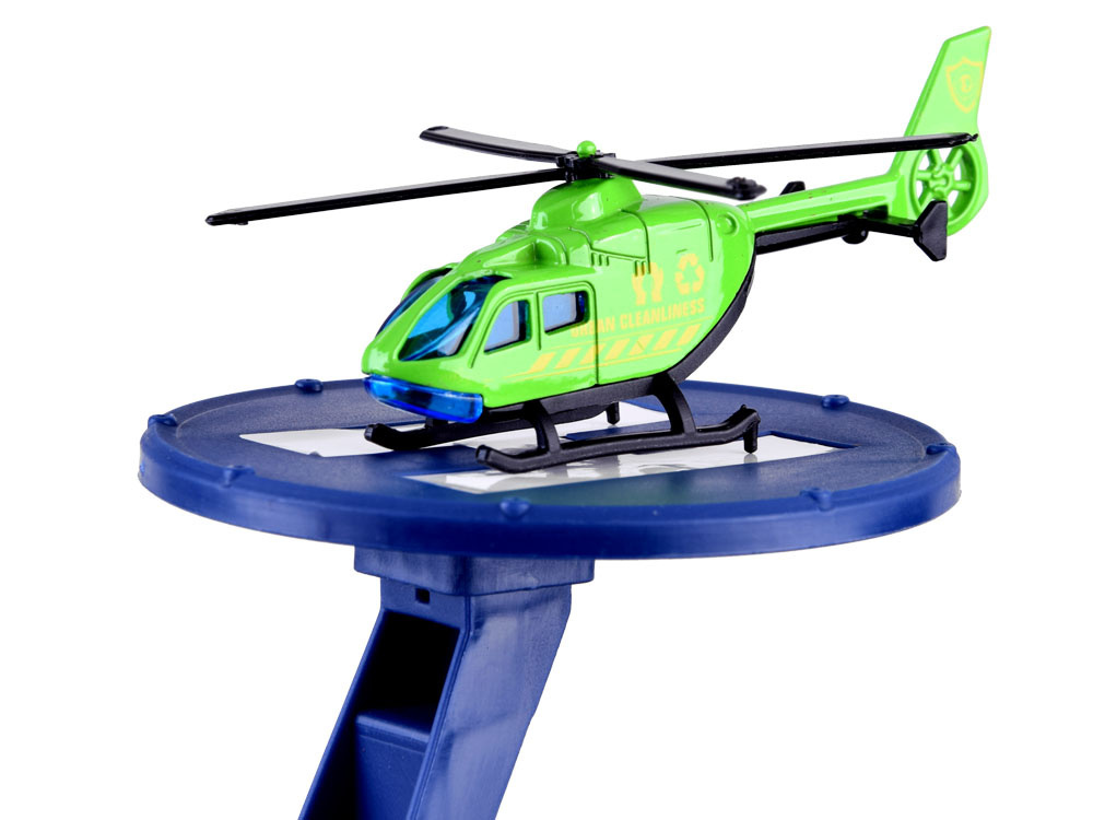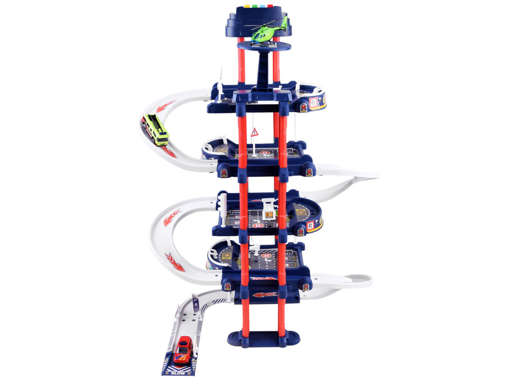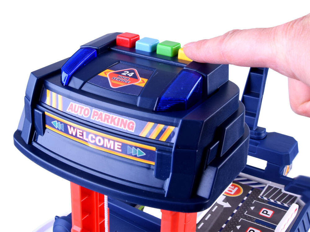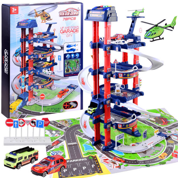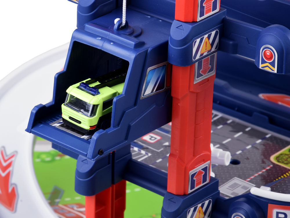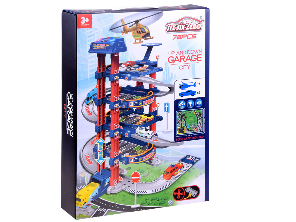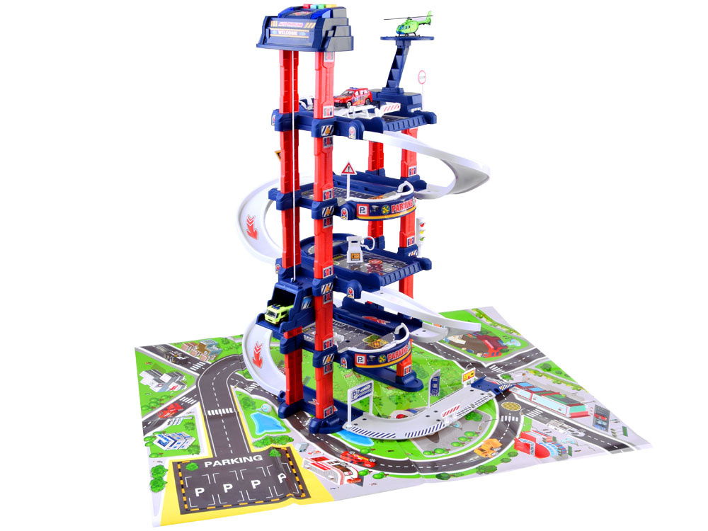 Rewelacyjny wielopoziomowy parking ze stacją benzynową, podnośnikiem, windą, warsztatem samochodowym, lądowiskiem dla helikoptera. Parking przystosowany jest dla "resoraków". Za pomocą windy autko może przemieszczać się na poszczególne piętra parkingu. Jeśli braknie benzyny bez problemu zatankujesz na stacji benzynowej. Gdy chcesz naprawić swój samochód skorzystaj z podnośnika, dzięki któremu naprawisz zawieszenie czy zmienisz oponę. Zestaw zawiera wiele dodatkowych elementów wspaniale urozmaicających zabawę, takich jak znaki drogowe, pachołki.