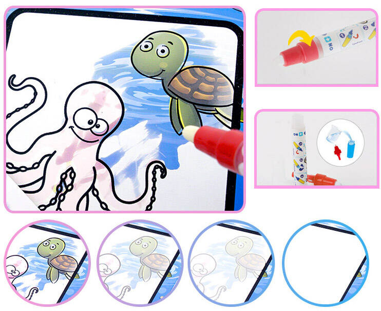 Powtarzalna zabawa: Malowanka została zaprojektowana tak, aby można było ją używać wielokrotnie. Po wyschnięciu rysunków można je łatwo wymazać, pozostawiając kartkę gotową do nowego projektu.