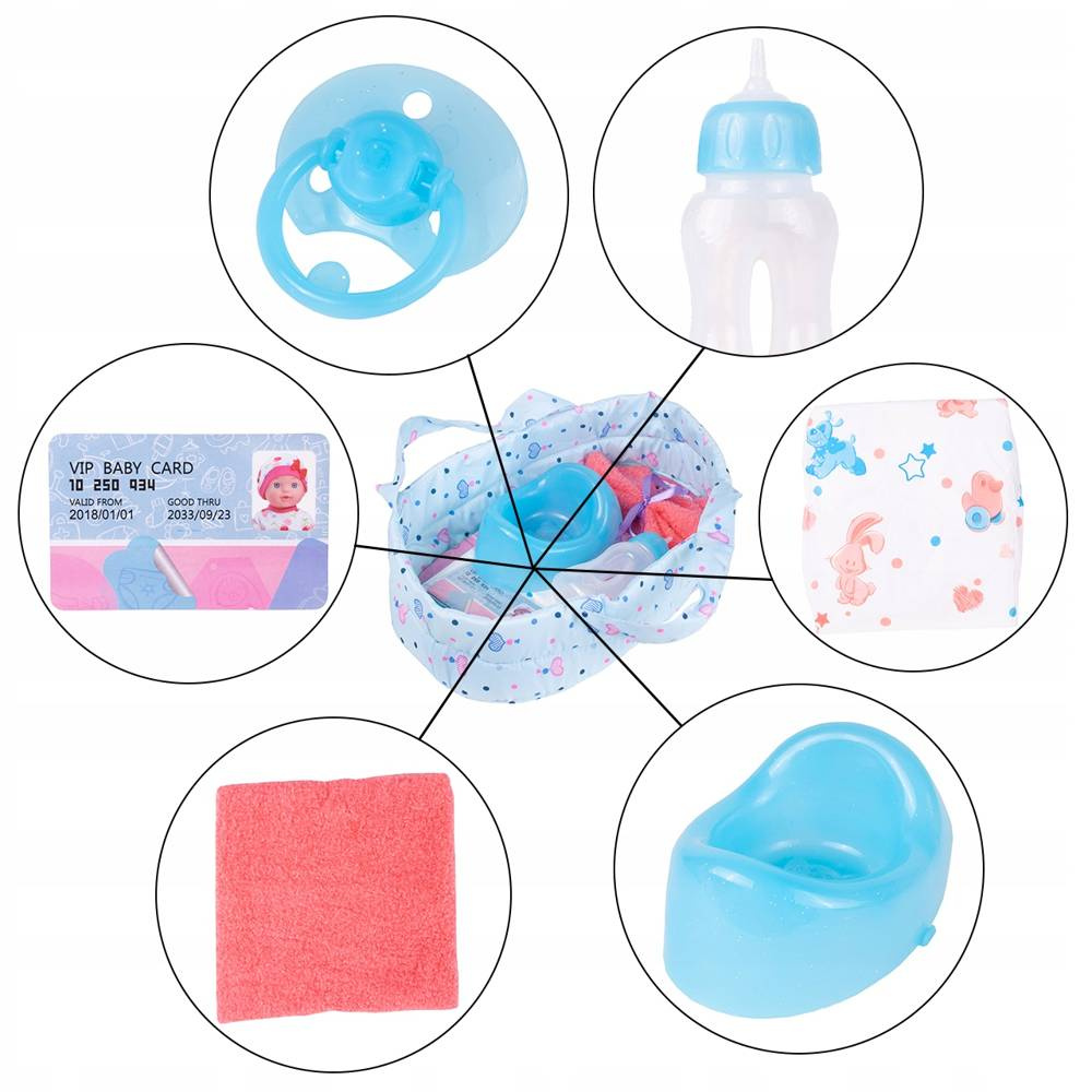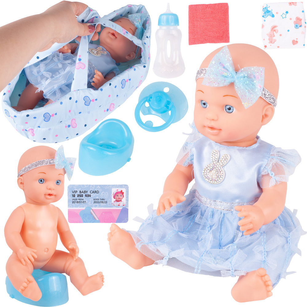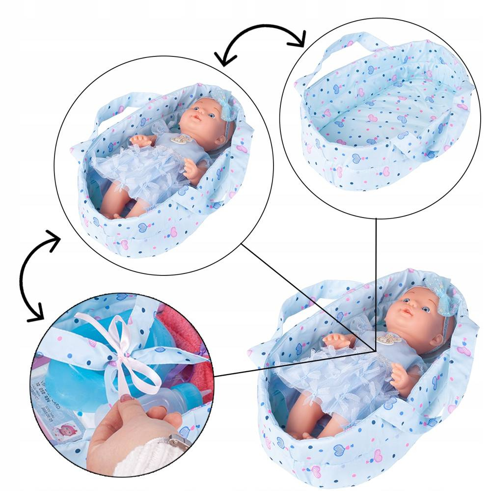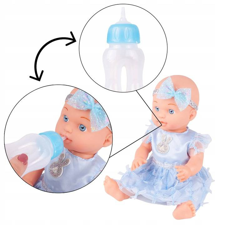 Przeurocze i kochane maleństwo ma w sobie ciepło prawdziwego dzidziusia. Ubrana w piękną, niebieską sukienkę oraz opaskę z kokardką na główce zachęca do przytulania, całowania i bawienia.Lalkę można przewijać, poić z buteleczki lub wkładać do buzi smoczek.